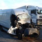 Ein britischer Lenker fuhr mit seinem Kleinlaster mit hoher Geschwindigkeit auf einen LKW Anhänger auf und wurde in seinem Fahrzeug eingeklemmt.