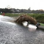 Der letzte Unwettereinsatz an diesem Abend betraf die eigene Feuerwehr: unser Transparent für das Feuerwehrfest war vom Sturm teilweise ausgerissen worden und drohte, von größeren Fahrzeugen