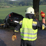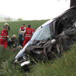 Sofort wurden sämtliche Utensilien für eine Menschenrettung vorbereitet, da das Fahrzeug drohte, in den angrenzenden Acker zu stürzen. Der Einsatzleiter konnte aber kurz nach seiner Erkundung Entwarnung geben: keine eingeklemmten Personen mehr im Fahrzeug!