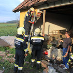 Ein ansässiger Landwirt übernahm mit seinem Traktor die weitere Bergung des völlig zerstörten Fahrzeuges. Wir sicherten noch die Einschlagstelle des Gebäudes, sodass keine Gefahr mehr für weitere Einsatztätigkeiten bestand. Nachdem das Unfallauto fachgerecht und gesichert abgestellt wurde, konnten wir unseren Einsatz beenden.