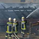 Unsere Wehr stellte alle einsatzbereiten Atemschutzgeräteträger zur Verfügung und begann unverzüglich mit den Löscharbeiten am Heuschuppen. Außerdem wurde mit dem Tanklöschfahrzeug ein Pendelverkehr eingerichtet und mit dem Kleinlöschfahrzeug einige Angriffsleitungen gelegt.
