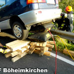 Der Minivan hatte augenscheinlich keinen größeren Schaden davongetragen, deshalb strebten wir eine möglichst schonende Fahrzeugbergung an. Mit einem Hebekissen wurde das Auto soweit angehoben, dass eine stabile Unterkonstruktion gebaut werden konnte, dass das Fahrzeug nicht weiter abrutschen konnte und auch nicht kippte. Vorsichtig bewegten wir den Minivan zur Seite, dass dieser nicht mehr auf der Leitschiene aufsaß. Nach und nach wurde dann das Unterlegsholz entfernt und das Auto wieder auf sicheren Boden abgestellt.