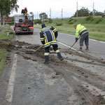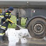 Aufgrund der Zuladung war es nicht möglich den LKW mittels Seilwinde aus seiner misslichen Lage zu befreien. So musste dieser zuerst entladen werden, um mit der Bergung zu beginnen. Nachdem der Sattelschlepper wieder Asphalt und den Rädern hatte, wurde dieser gereinigt, um eine größere Verschmutzung der Straße zu verhindern.