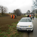 Mit einem vollbesetzten Rüstfahrzeug konnten wir nach kurzer Zeit zum Einsatzort ausrücken. An der Einsatzstelle bot sich uns folgendes Bild: ein VW Bus lag auf der Seite im Acker, die vermeintlichen Insassen standen am Straßenrand und die Polizei nahm bereits den Unfall auf.