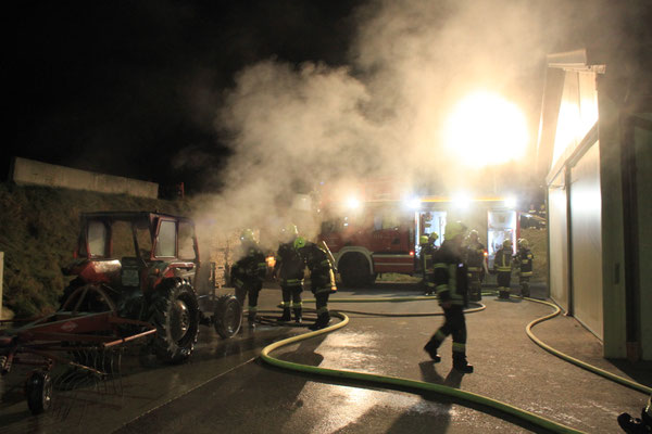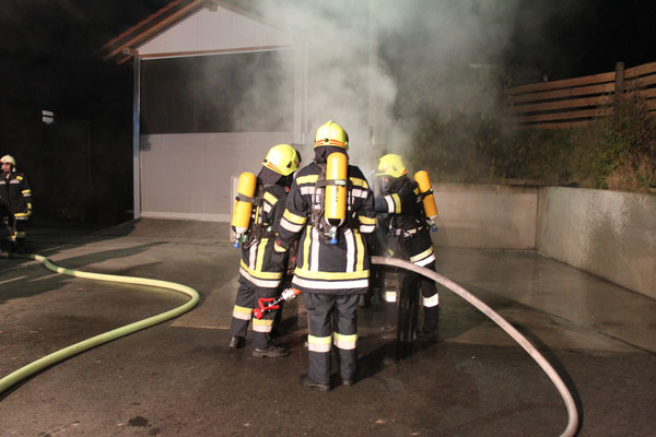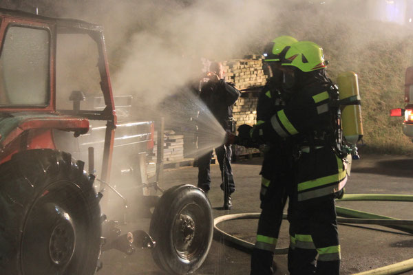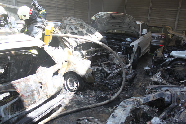 Nach der Ankunft begannen die beiden Atemschutztrupps unverzüglich mit den Löscharbeiten. Gemeinsam mit den Feuerwehren Untergrafendorf und Außerkasten-Furth, wurden die 5 in Vollbrand stehenden Fahrzeuge gelöscht.