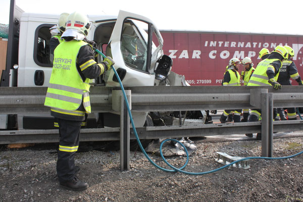 Ein Kleinbus prallte aus unbekannten Gründen gegen das Heck eines Lastwagens. Der Lenker des Fahrzeuges konnte sich selbst befreien. Der Beifahrer war aufgrund des Aufpralles im Fahrzeug eingeklemmt.
