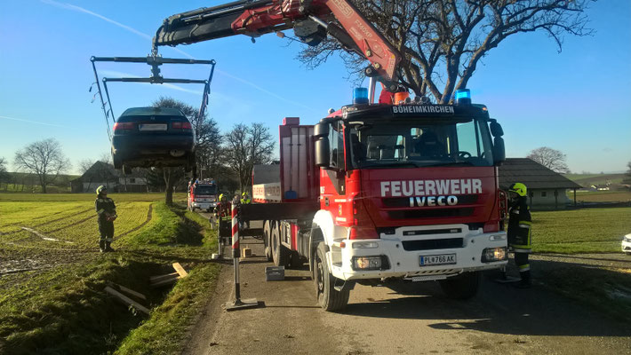 Mittels unseres WLF's hoben wir das verunfallte Fahrzeug aus dem Straßengraben heraus.