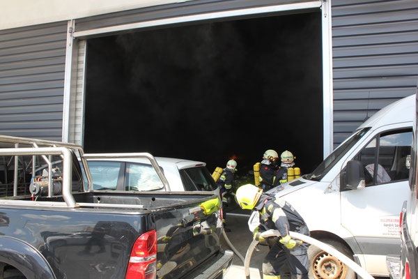 Schon bei der Anfahrt bot sich uns folgendes Bild: Eine Zelthalle, in der mehrere PKW gelagert sind, stand in Brand. Bei der Anfahrt rüsteten sich sowohl in unserem TLF, als auch im KLF je drei Atemschutzgeräteträger aus.