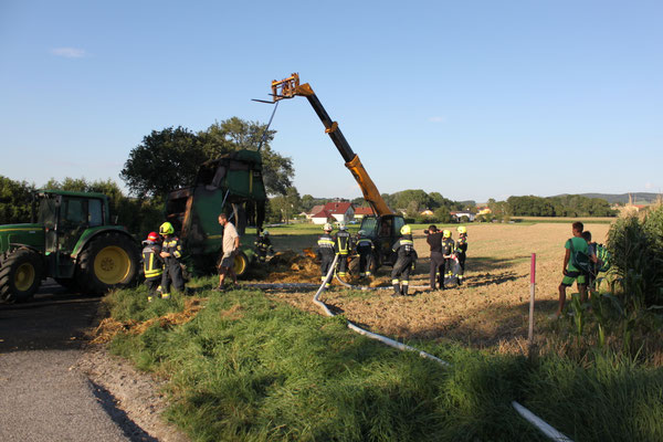 Unsere Aufgabe vor Ort bestand darin, die FF Untergrafendorf bei der Brandbekämpfung zu unterstützen. Mittels Teleskoplader wurde die Presse geöffnet um die letzten Glutnester löschen zu