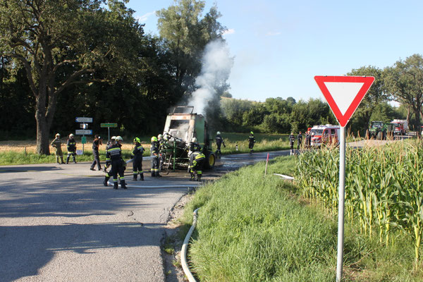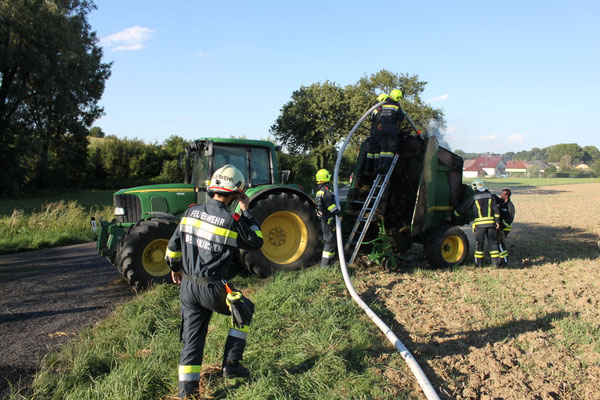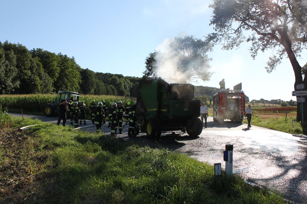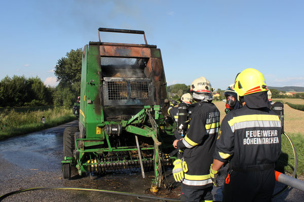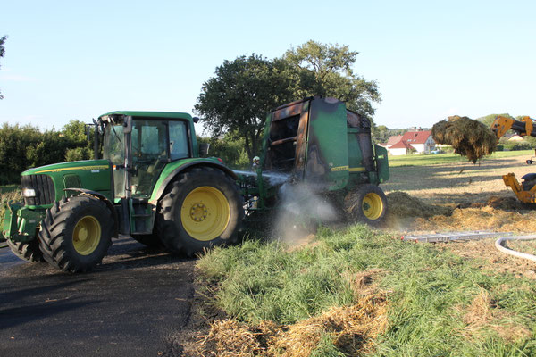 Heute 30.07.2016 wurden wir um 17:41 Uhr mit Sirene und Pager zu einem Brand einer Strohrundballenpresse auf die L5077 bei Schildberg alarmiert.