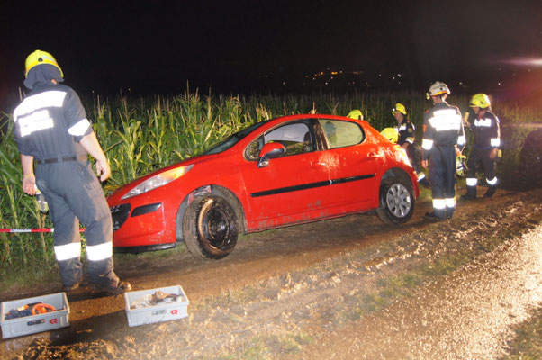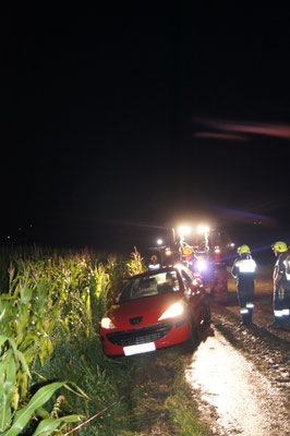 Nach der Lageerkundung stand fest, dass ein Fahrzeug von der schlammbedeckten Fahrbahn abgekommen ist. Mit Hilfe eines Traktors konnten wir, nach mehreren versuchen, das Fahrzeug aus dem Feld