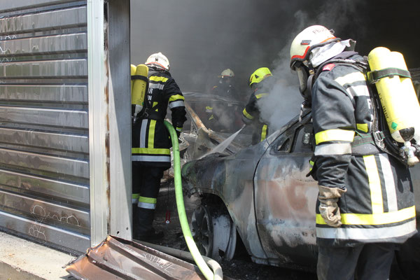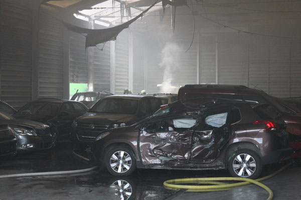 Schon bei der Anfahrt bot sich uns folgendes Bild: Eine Zelthalle, in der mehrere PKW gelagert sind, stand in Brand. Bei der Anfahrt rüsteten sich sowohl in unserem TLF, als auch im KLF je drei