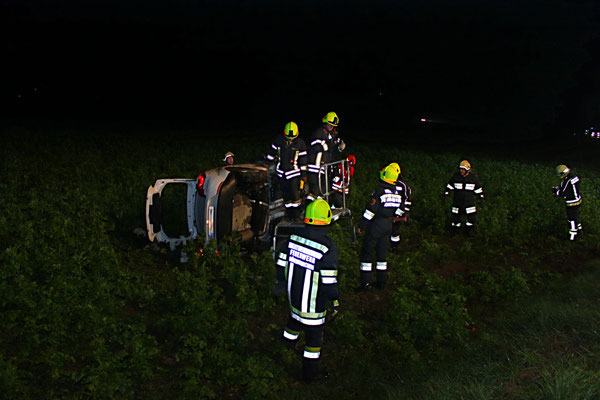 Gemeinsam mit den beiden anderen Feuerwehren begannen wir unverzüglich mit der Menschenrettung. Die Person konnte rasch über die Beifahrertür befreit werden.
