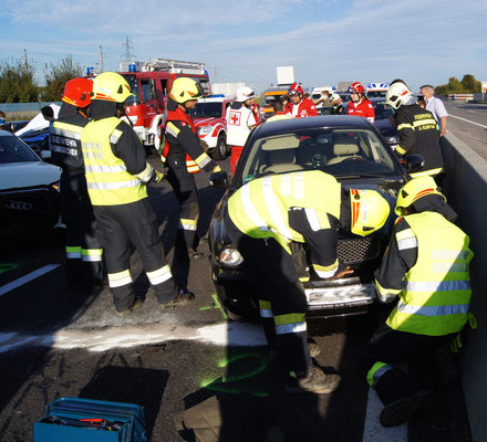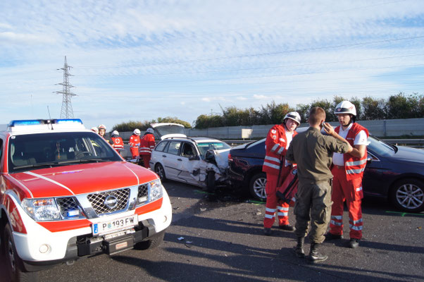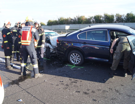 Nach der Lageerkundung stand fest, es handelt sich um einen Zusammenstoß von fünf Fahrzeugen. Nachdem die verletzten Personen von Notarzt, sowie Rettungsdienst versorgt wurden und die Exekutive