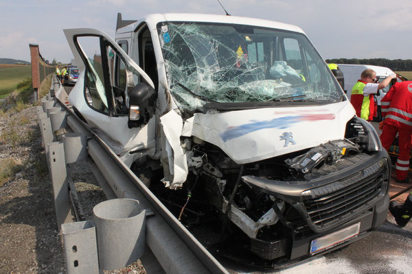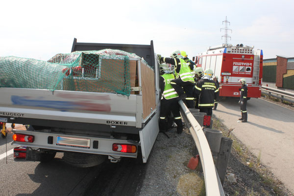 Ein Kleinbus prallte aus unbekannten Gründen gegen das Heck eines Lastwagens. Der Lenker des Fahrzeuges konnte sich selbst befreien. Der Beifahrer war aufgrund des Aufpralles im Fahrzeug