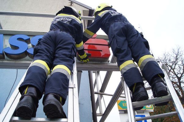 Da die Gefahr bestand, dass lose Glassplitter Passanten treffen könnten, war es unsere Aufgabe, die Werbeanzeige samt Glasplatte zu demontieren.
