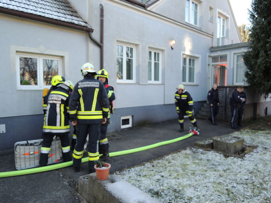 Nach dem Eintreffen führte ein Atemschutztrupp die Lageerkundung durch. Bei einem Überdruckventil im Heizraum strömte Dampf aus. Das Ventil konnte abgesperrt und die Heizung gemeinsam mit der Polizei stillgelegt werden.
