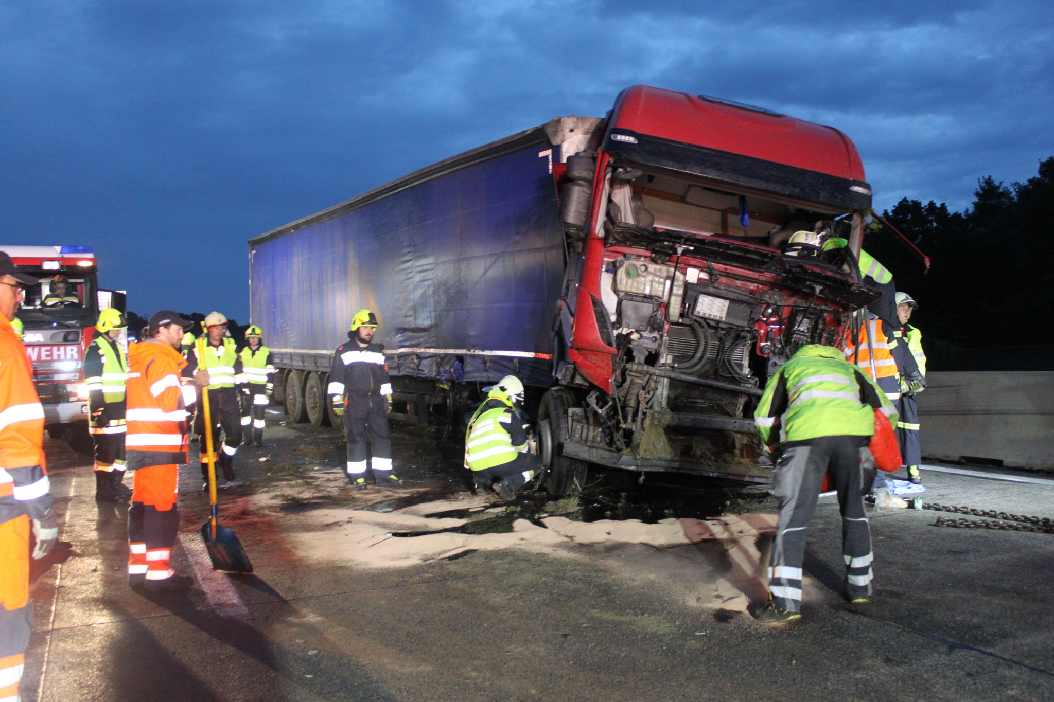 wurde mithilfe unseres Wechselladefahrzeugs von der Autobahn verbracht. Die ausgelaufenen Betriebsmittel wurden mittels Ölbinder gebunden.