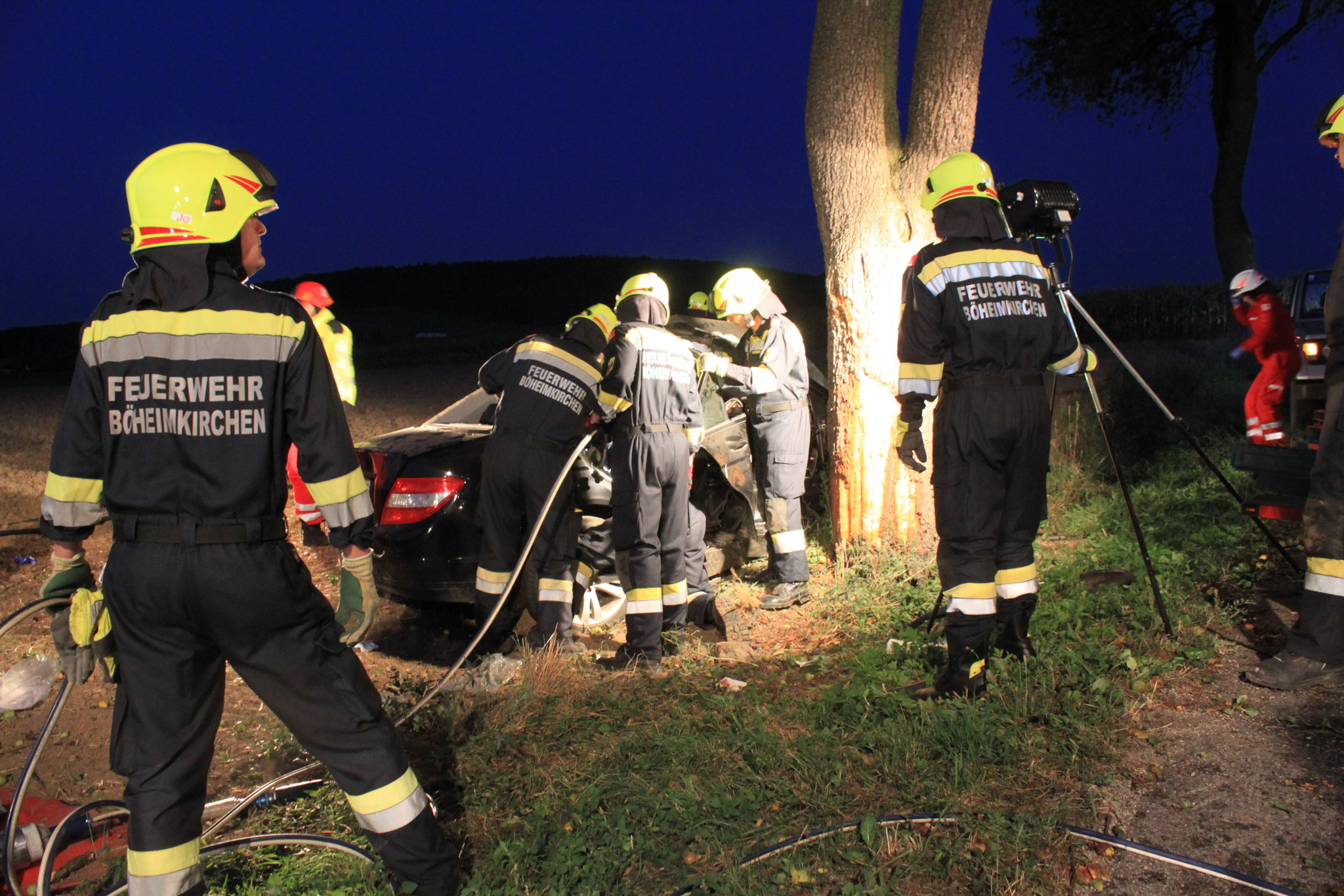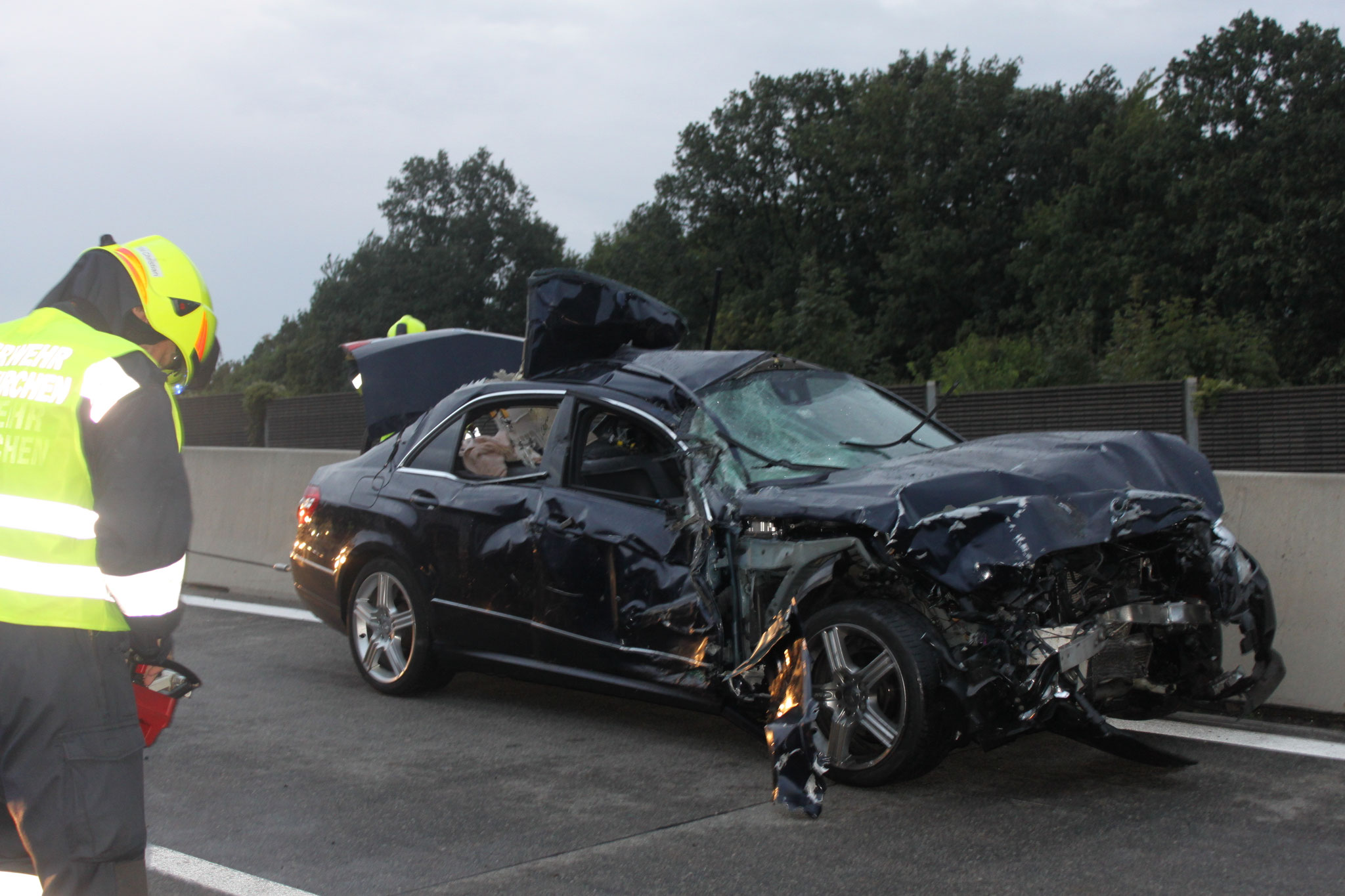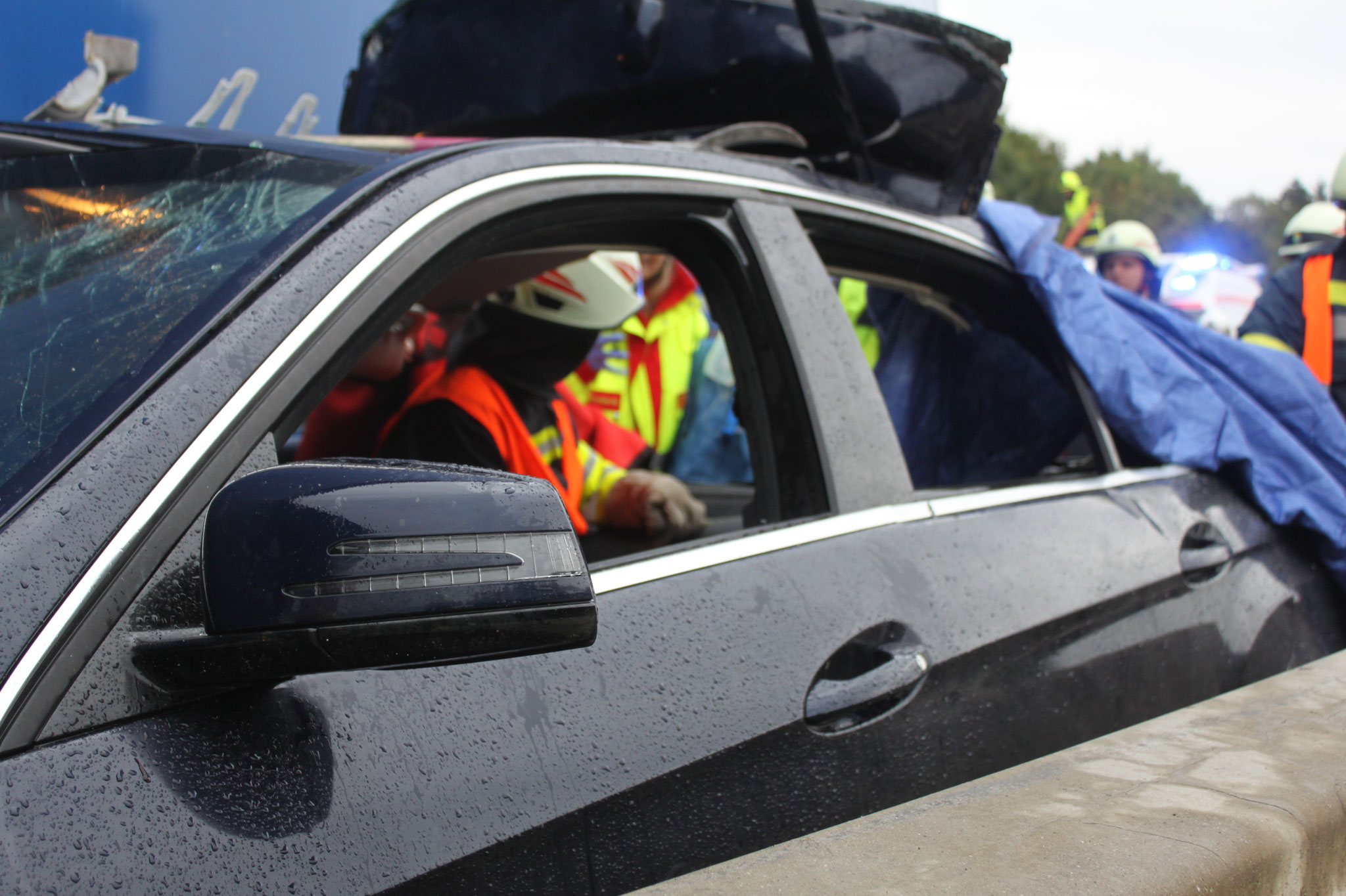 musste die Heckscheibenöffnung mittels hydraulischem Rettungsgerätes vergrößert werden. Noch während der Menschenrettung wurde ein zweifacher Brandschutz aufgebaut.
