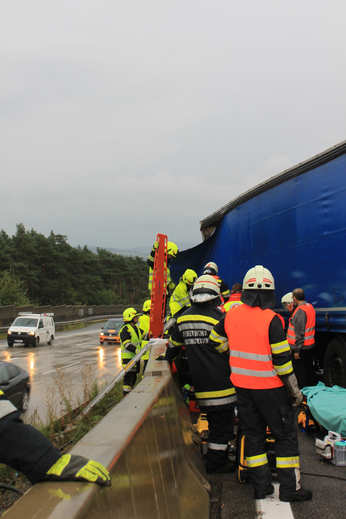 Gemeinsam mit den Feuerwehren FF Kirchstetten-Markt und FF St.Pölten-Stadt wurden wir vor folgendes Szenario gestellt: Ein PKW steckte zwischen der Betonschutzwand und einem Lastkraftwagen fest.