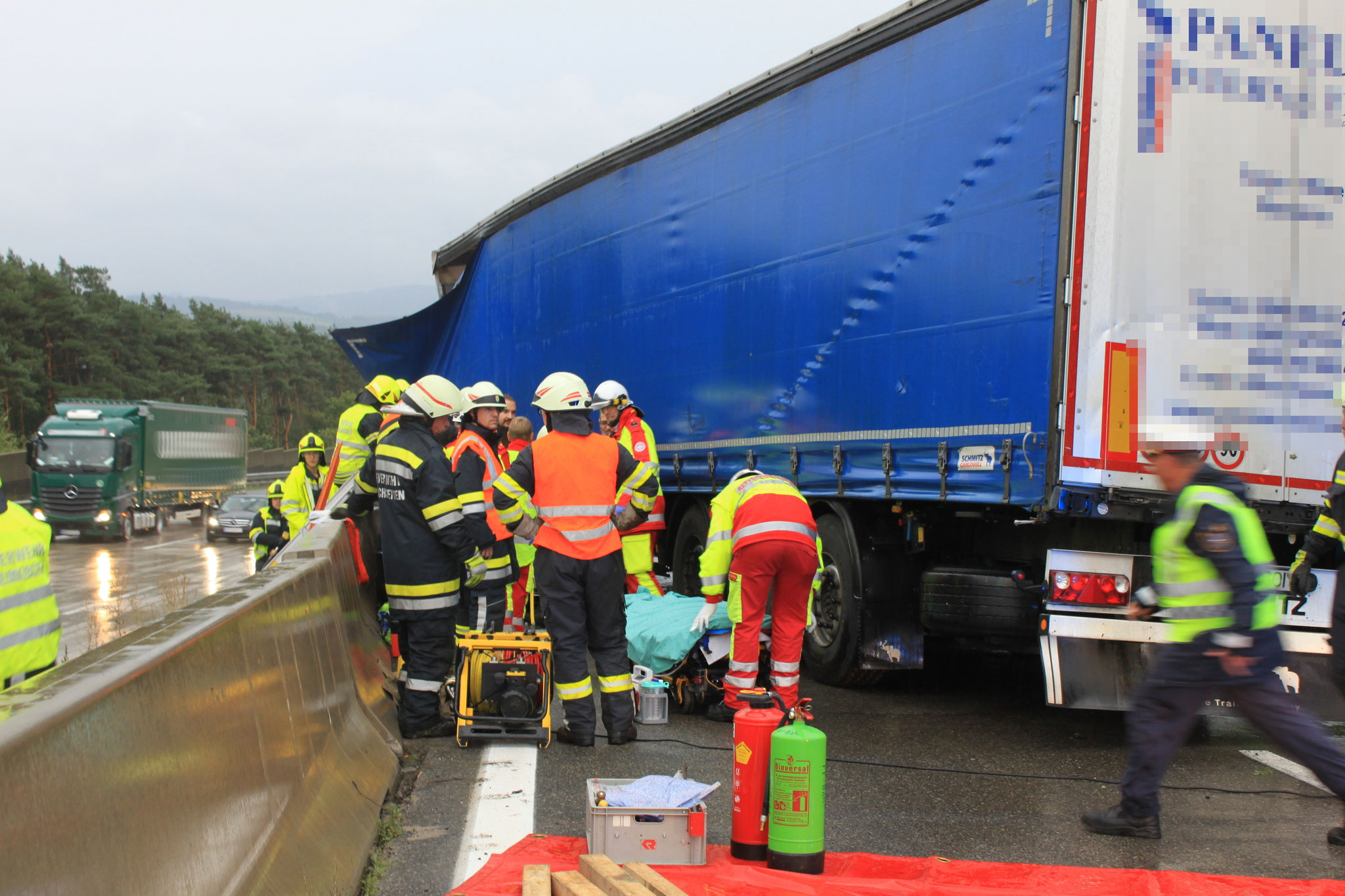 der Person wurde diese der Rettung übergeben und mit schweren Verletzungen ins Krankenhaus eingeliefert. Während der Rettungsarbeiten wurde ein Feuerwehrmann leicht verletzt. Die Fahrzeugbergung