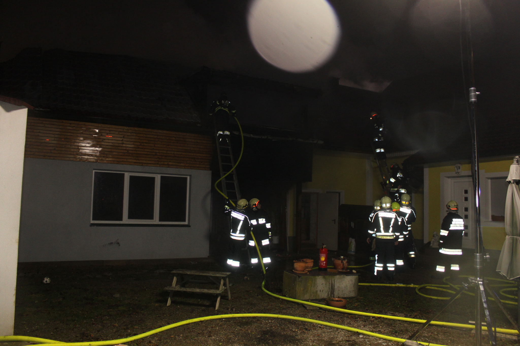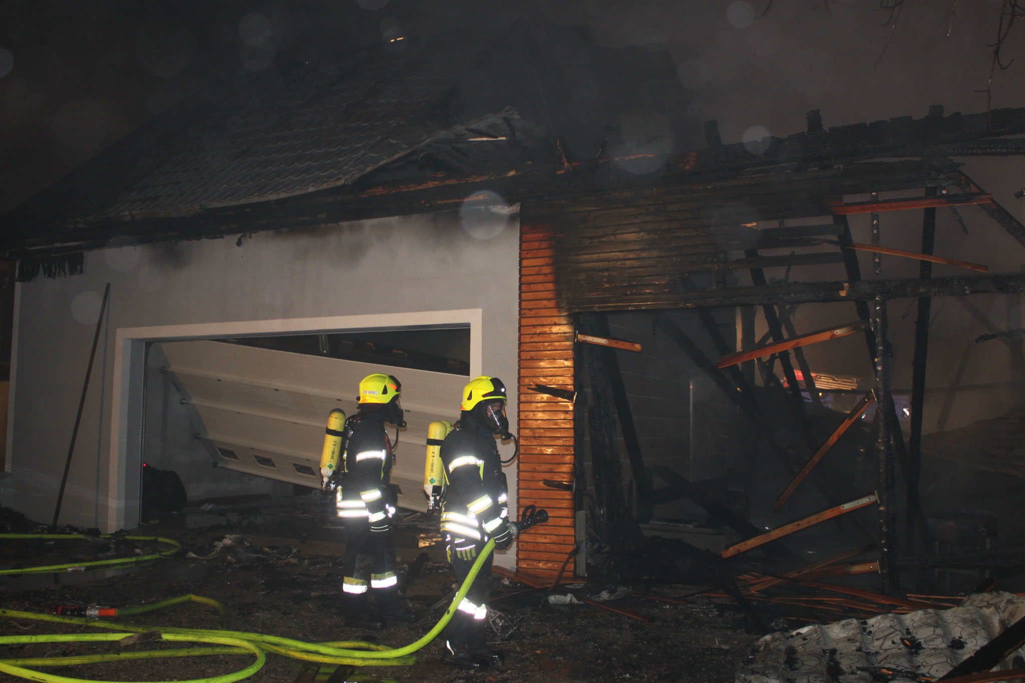 Als Erstmaßnahme wurden das angrenzende Wohngebäude und das Nachbarobjekt vor den Flammen geschützt. Sekundär wurde mit der Brandbekämpfung begonnen. Damit der Brandherd bekämpft werden konnte,