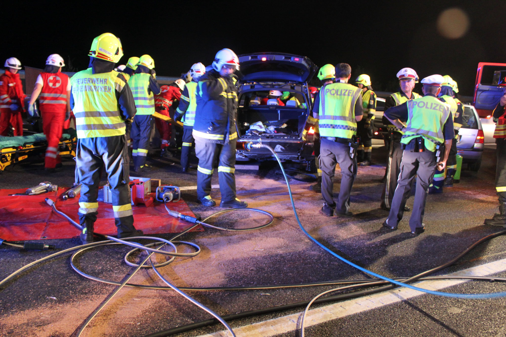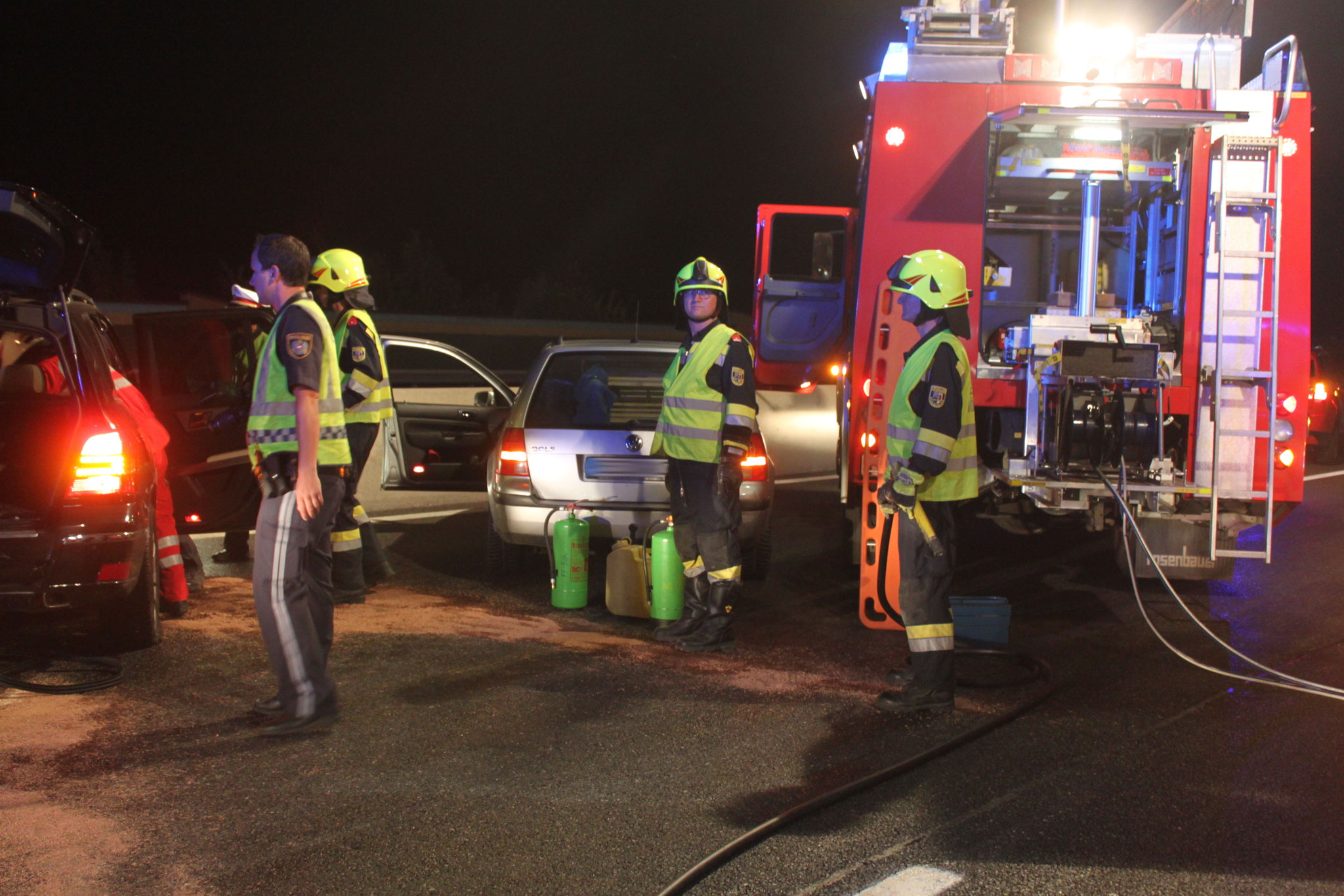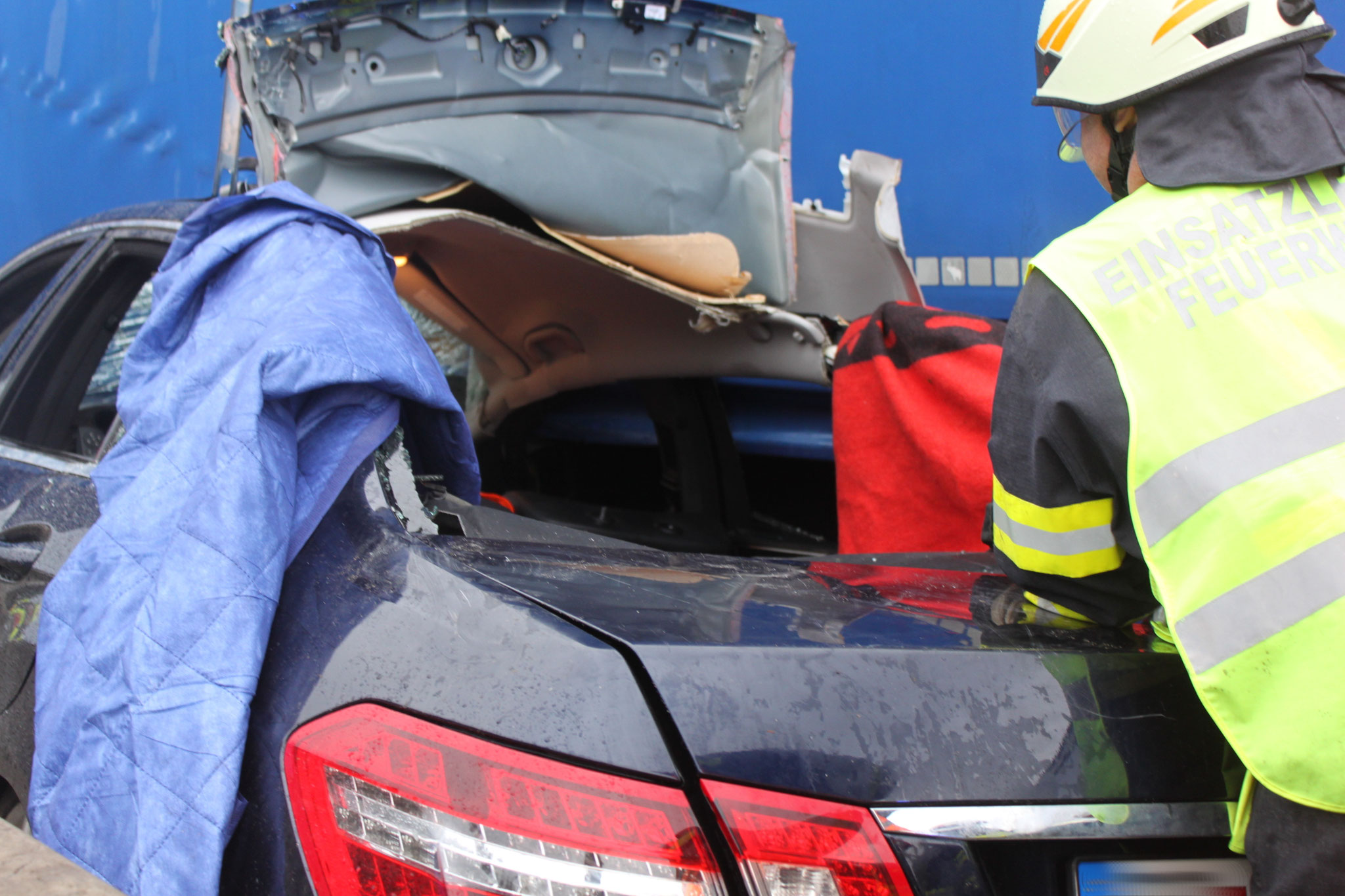 musste die Heckscheibenöffnung mittels hydraulischem Rettungsgerätes vergrößert werden. Noch während der Menschenrettung wurde ein zweifacher Brandschutz aufgebaut.