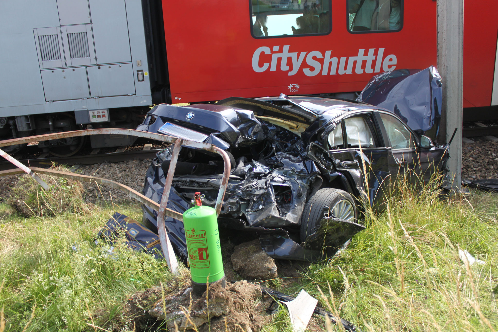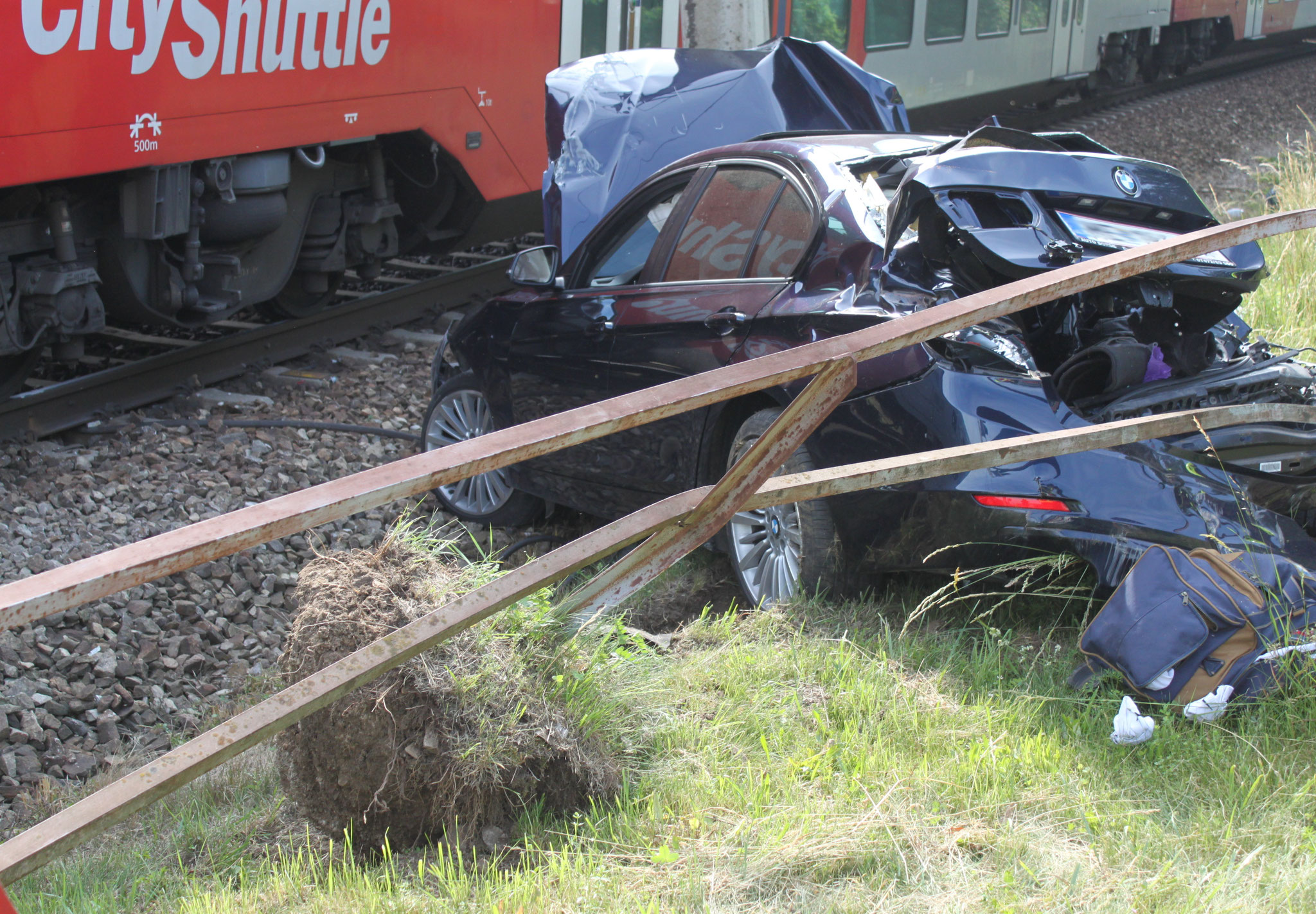 Eisenbahnkreuzung lenken. Ein herannahender Zug erfasste den PKW und schleuderte diesen gegen die Bahnschranke. Der Fahrer konnte sich im letzten Moment noch selbstständig vom Fahrzeug