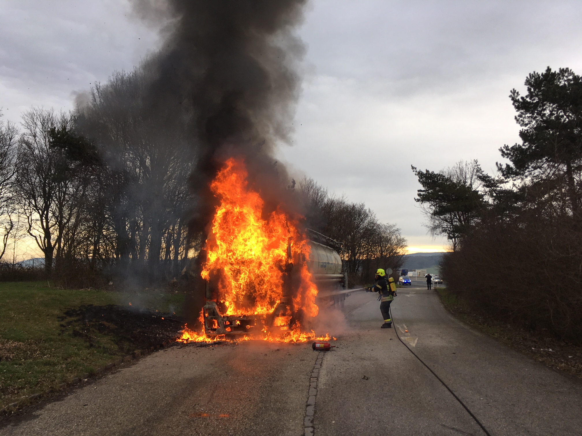 weitere Einsatzkräfte alarmiert. Die Zugmaschine eines Lastwagens stand in Vollbrand. Ein großflächiges Übergreifen auf den Anhänger konnte durch das schnelle Eingreifen unserer Wehr verhindert