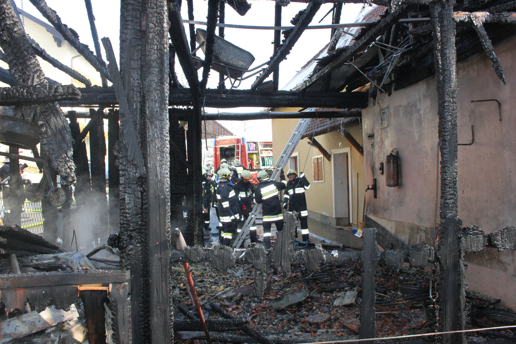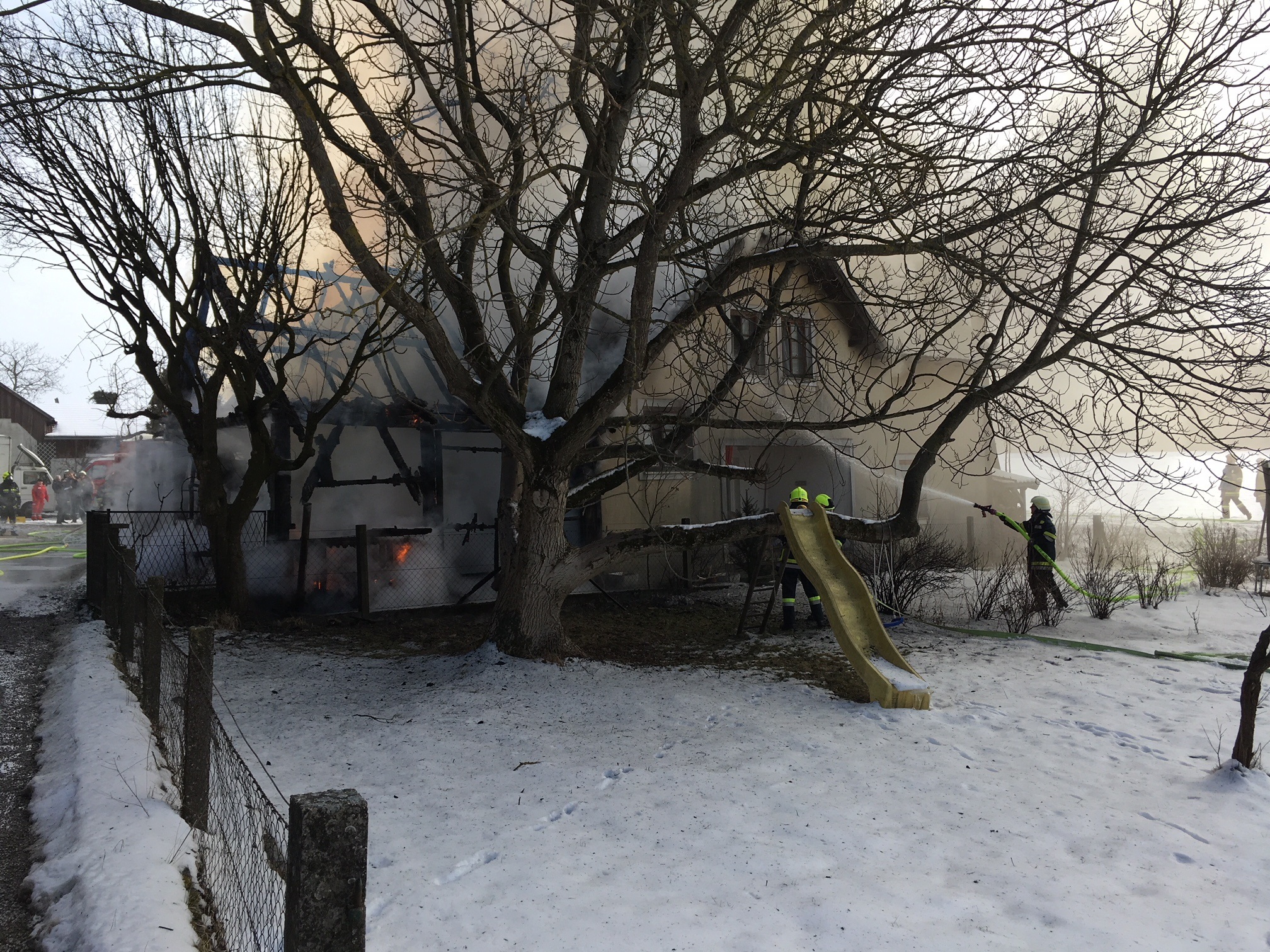 Beim Eintreffen wurden wir vor folgendes Szenario gestellt: Die Garage eines Wohnhauses stand in Vollbrand, wobei sich die Flammen bereits auf den Dachstuhl ausgebreitet hatten.