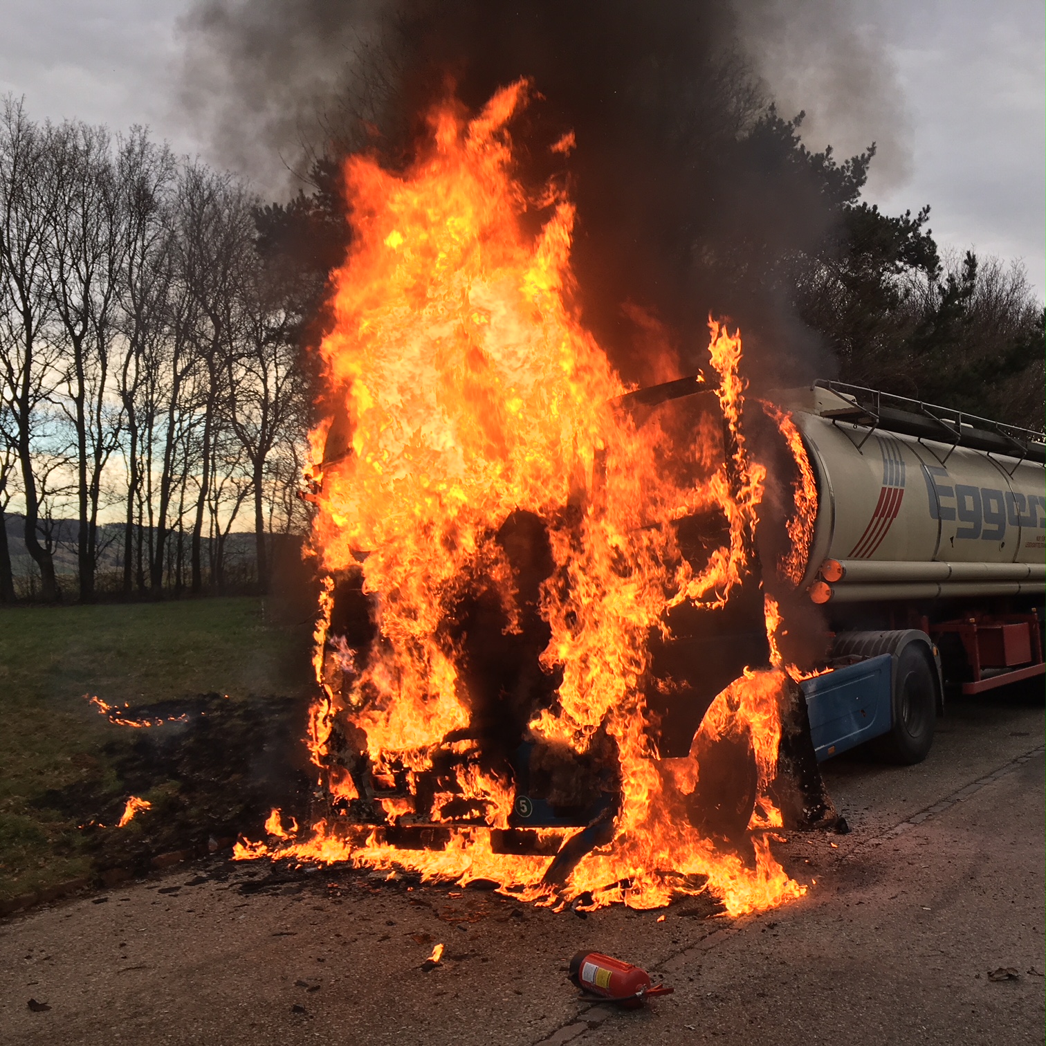 Eine starke Rauchentwicklung war schon von weitem zu erkennen. Die Zugmaschine eines Lastwagens stand in Vollbrand. Ein großflächiges Übergreifen auf den Anhänger konnte durch das schnelle