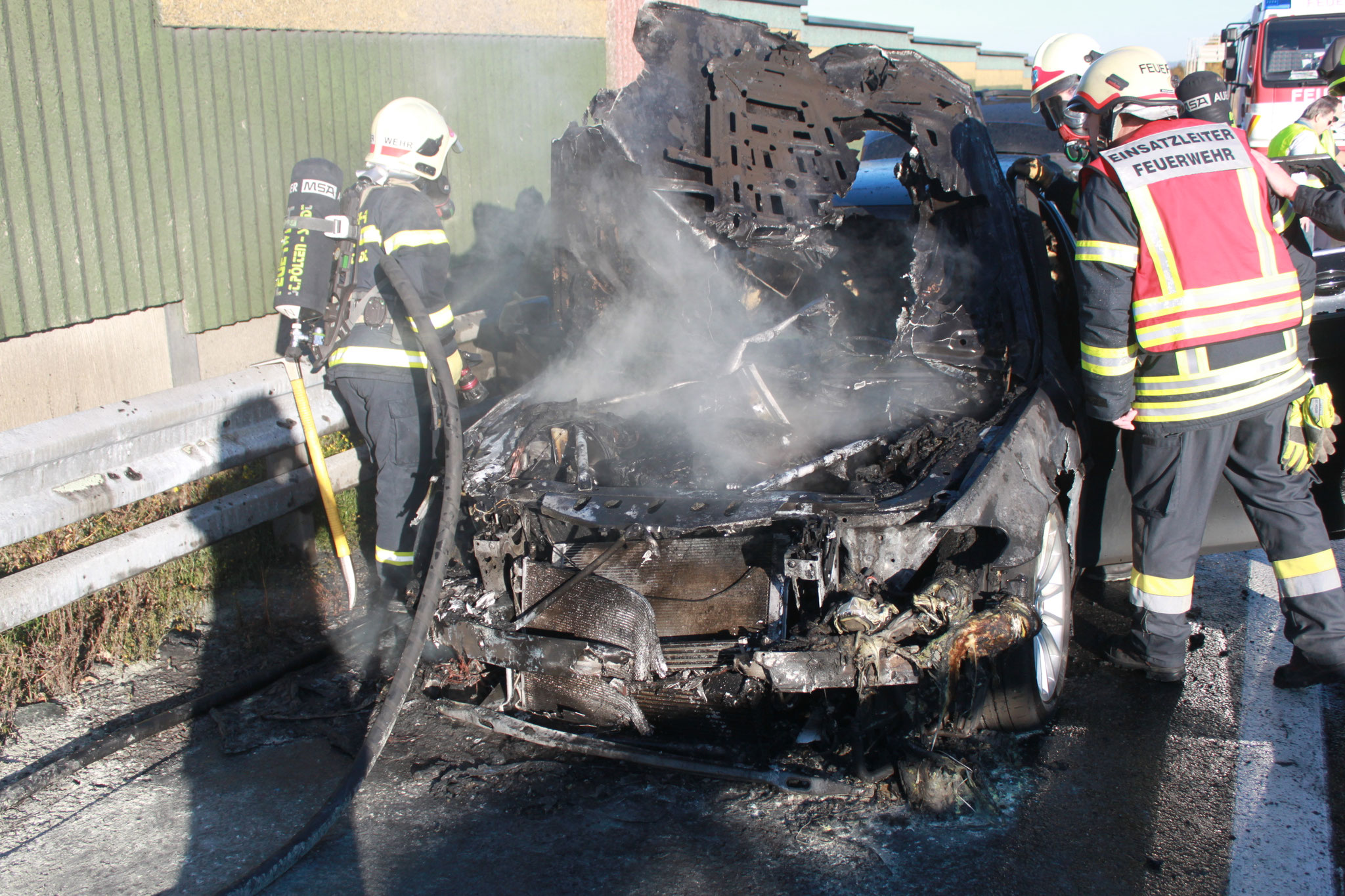 Beim Eintreffen wurden wir vor folgendes Szenario gestellt: Ein PKW stand am Pannenstreifen in Vollbrand.