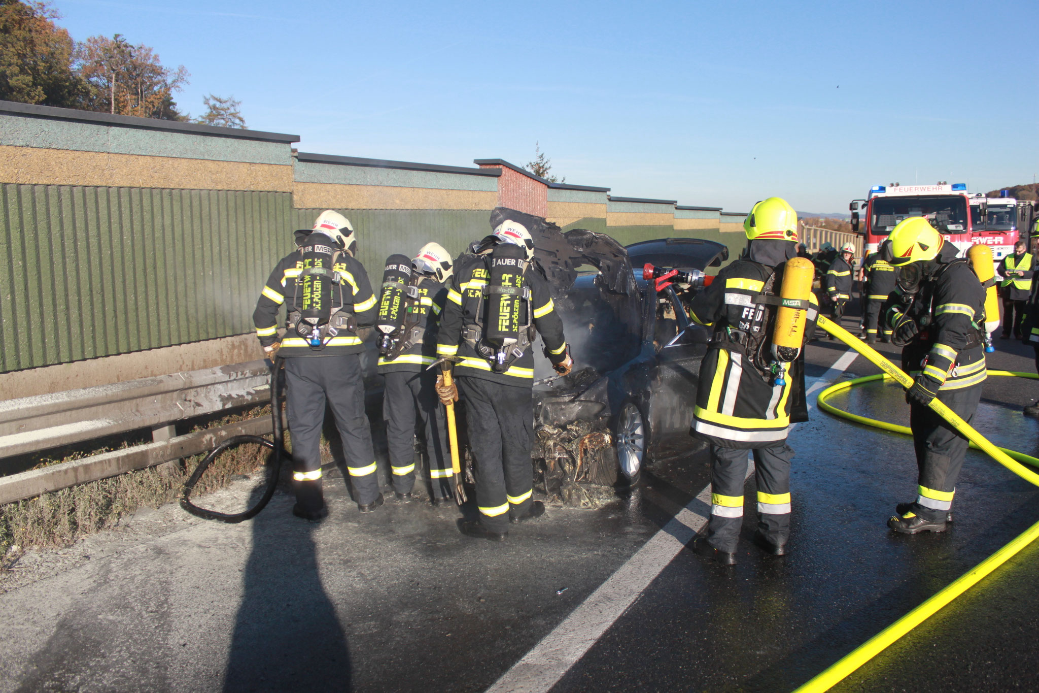 Gemeinsam mit der Freiwilligen Feuerwehr St.Pölten-Stadt, wurde das brennende Fahrzeug unter schwerem Atemschutz gelöscht. Mittels Wärmebildkamera wurde das Fahrzeug auf weitere Glutnester