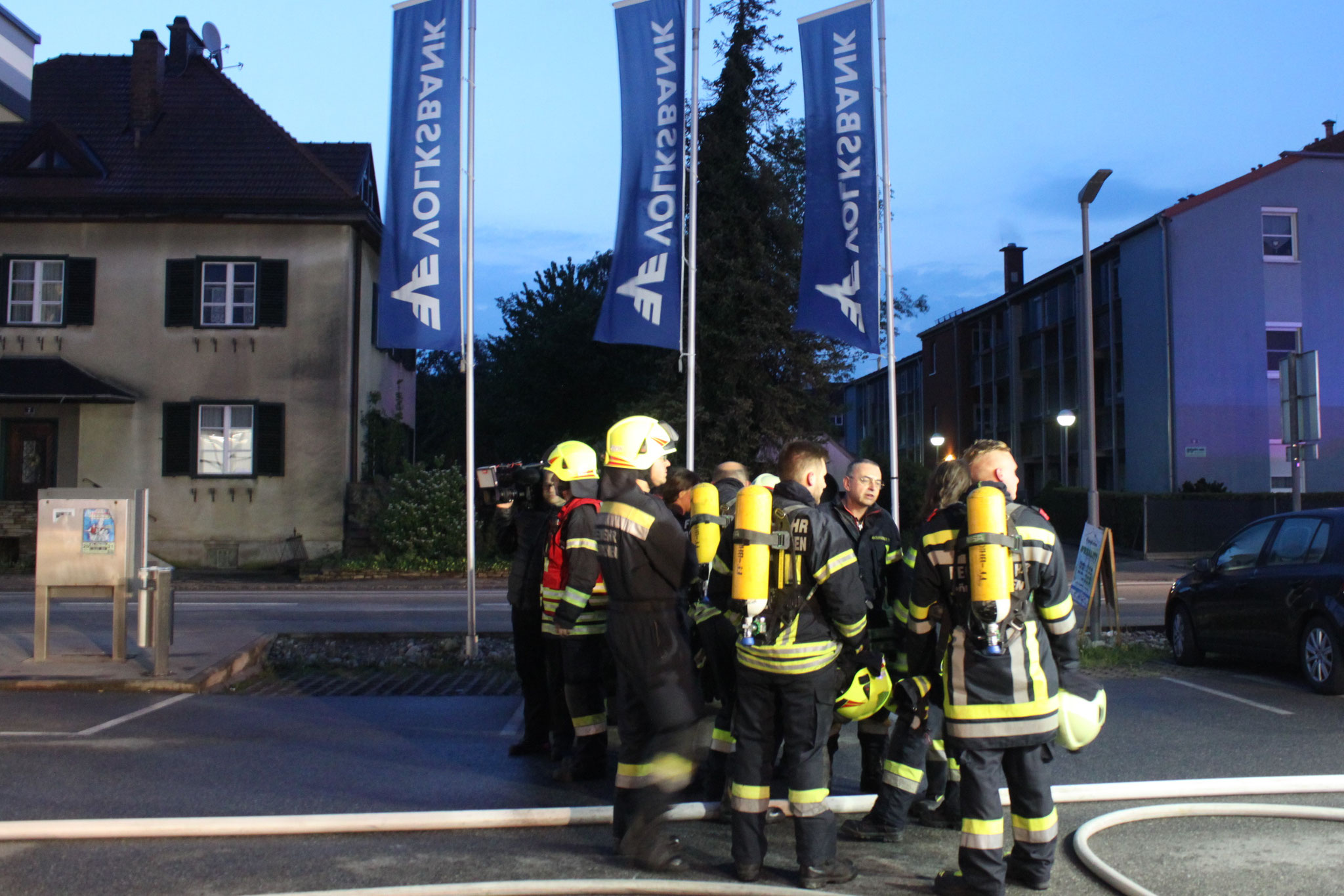 Nach dem gescheiterten Versuch den Bankomaten dieser gewaltsam zu öffnen, fing der Teppich im Foyer der Bank Feuer. Nach der Lageerkundung stand unmittelbar fest, dass ein Eingreifen der weiteren