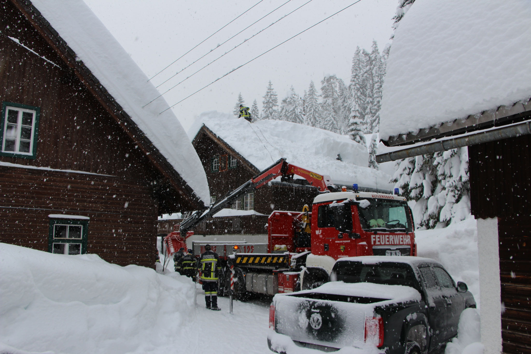 Um 08 Uhr begannen die Schneeräumarbeiten im Ort Gscheid. Mehrere Dächer wurden von den Einsatzkräften im Team vom Schnee befreit.
