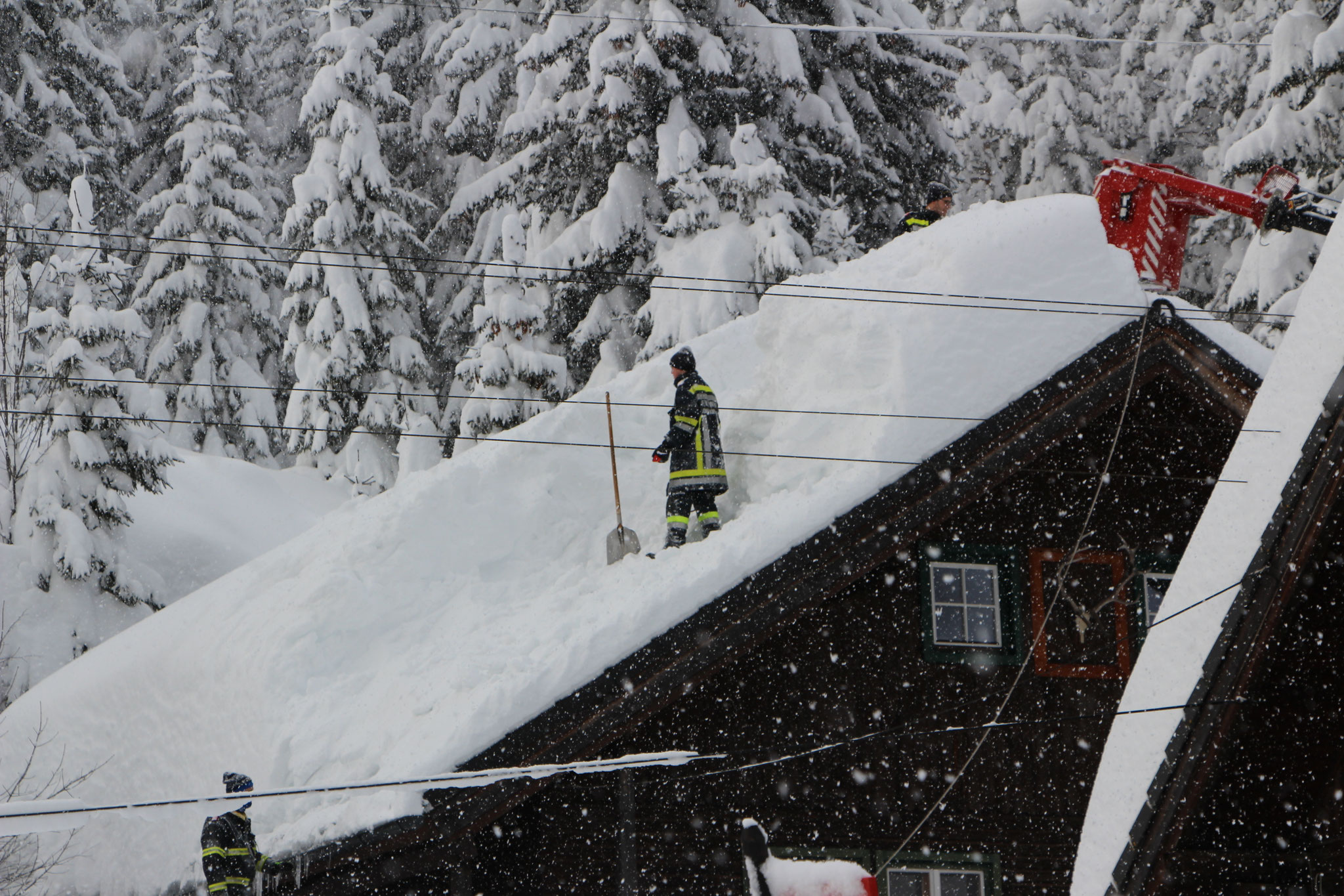 Um 08 Uhr begannen die Schneeräumarbeiten im Ort Gscheid. Mehrere Dächer wurden von den Einsatzkräften im Team vom Schnee befreit.