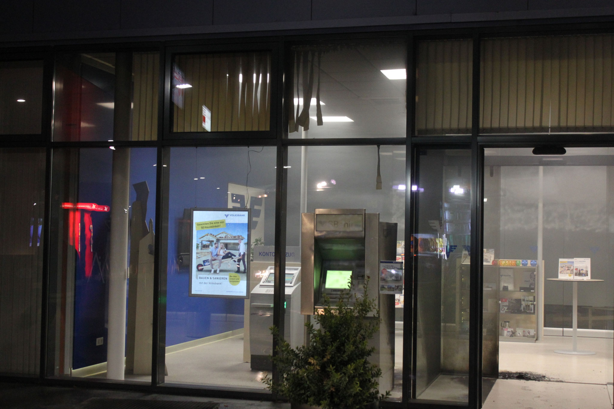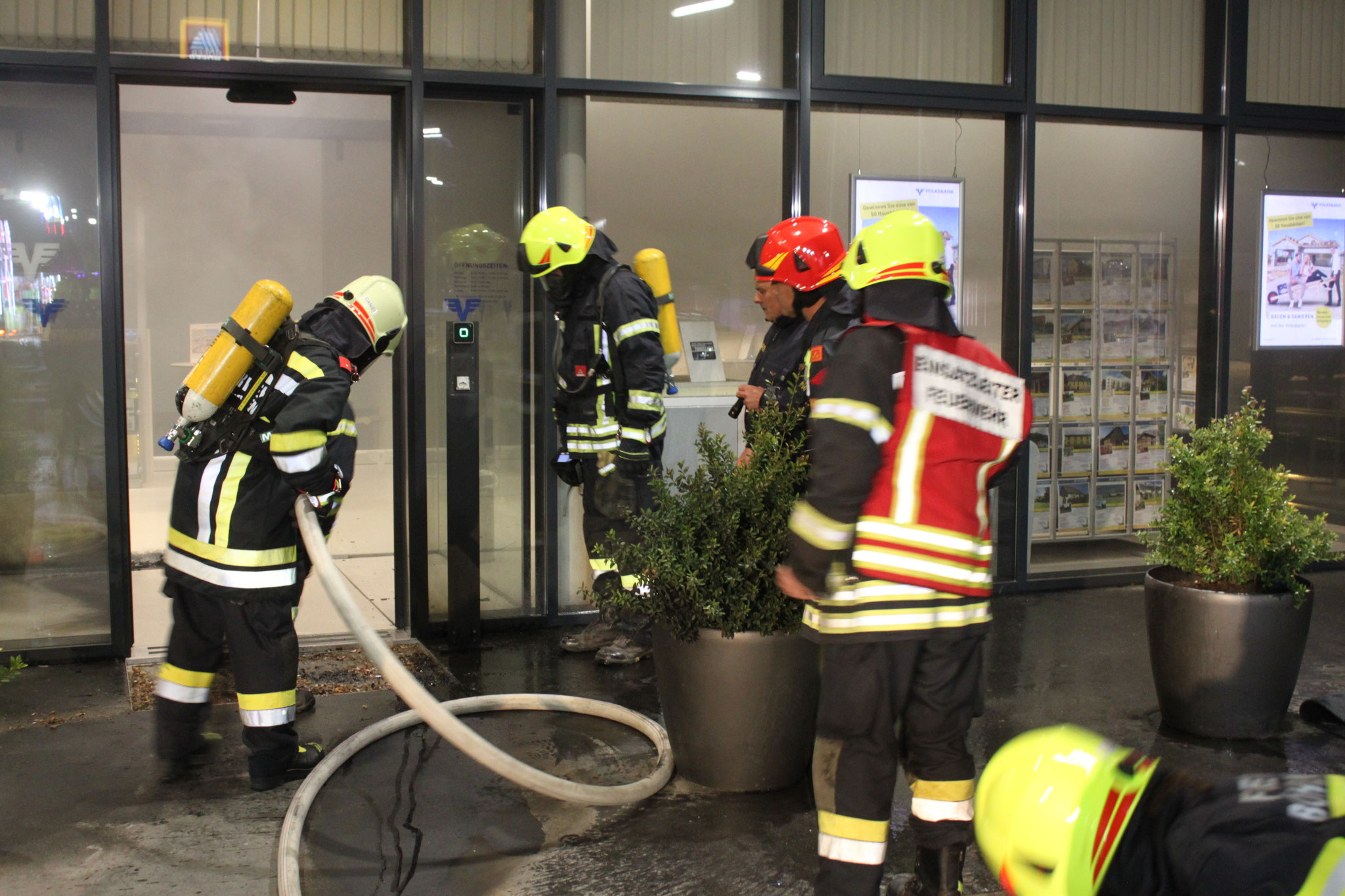 Nach dem gescheiterten Versuch den Bankomaten dieser gewaltsam zu öffnen, fing der Teppich im Foyer der Bank Feuer. Nach der Lageerkundung stand unmittelbar fest, dass ein Eingreifen der weiteren Feuerwehren nicht nötig ist.