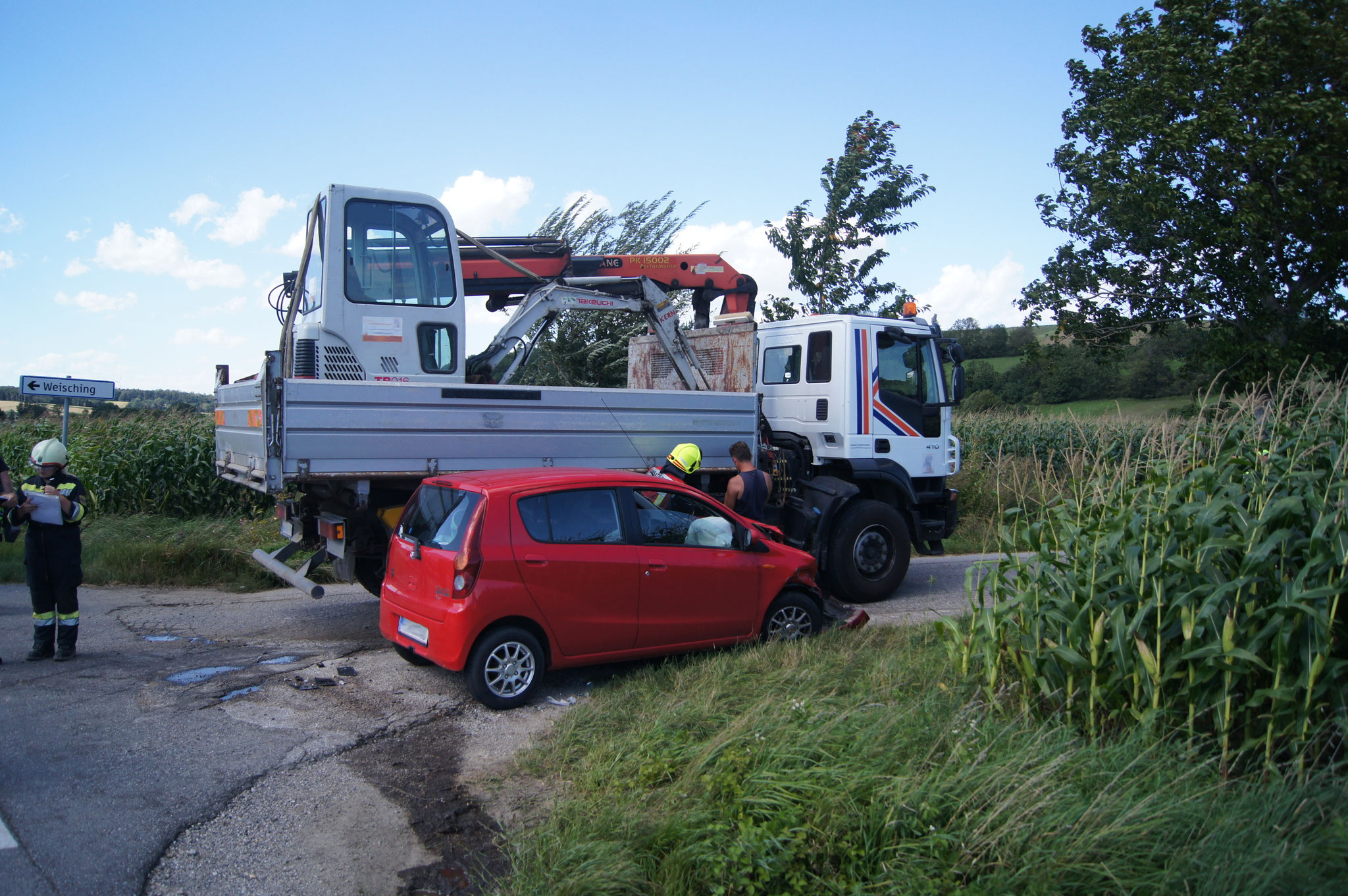 Am Einsatzort eingetroffen, bot sich uns folgendes Szenario: Ein PKW prallte im Kreuzungsbereich frontal gegen einen LKW. Die Aufgabe unserer Wehr bestand darin, den Rettungsdienst bei der