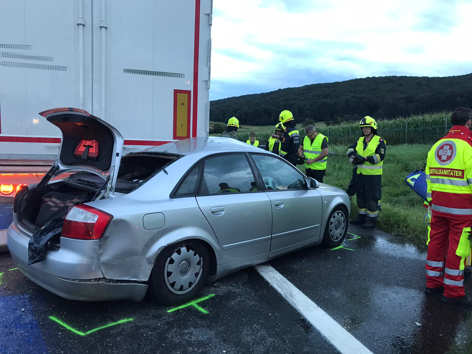 Ein PKW fuhr auf einen LKW auf, wodurch eine Person im Fahrzeug eingeschlossen wurde. Die Aufgabe der Wehren bestand darin, die eingeschlossene Person mittels hydraulischem Rettungsgerätes aus