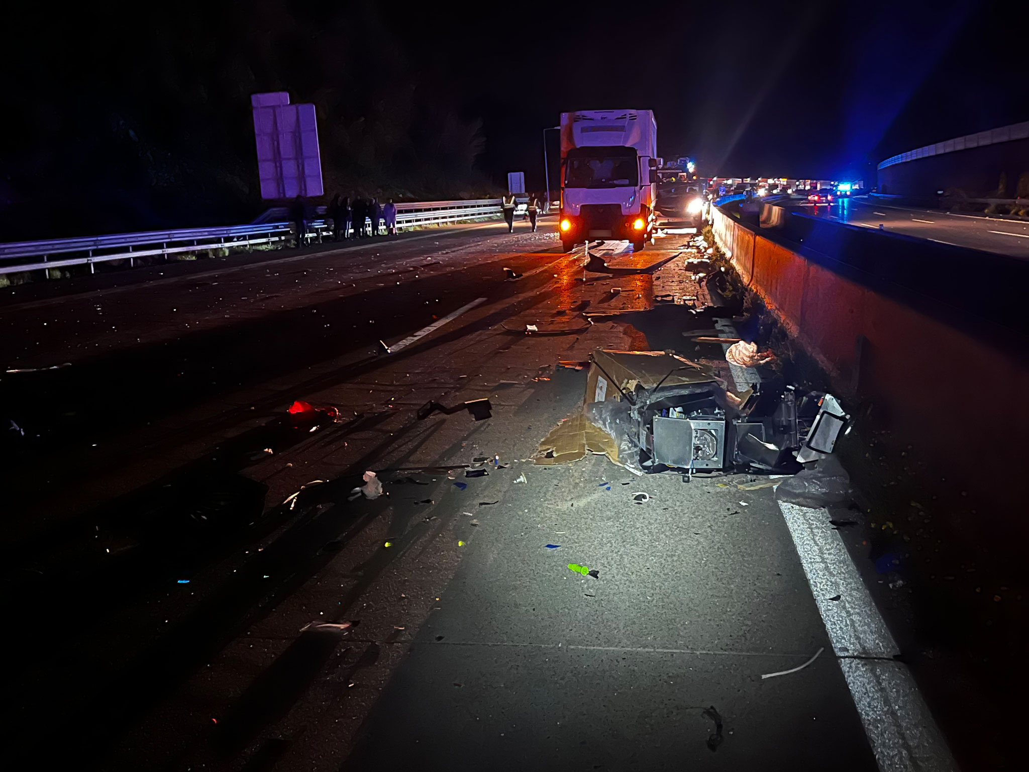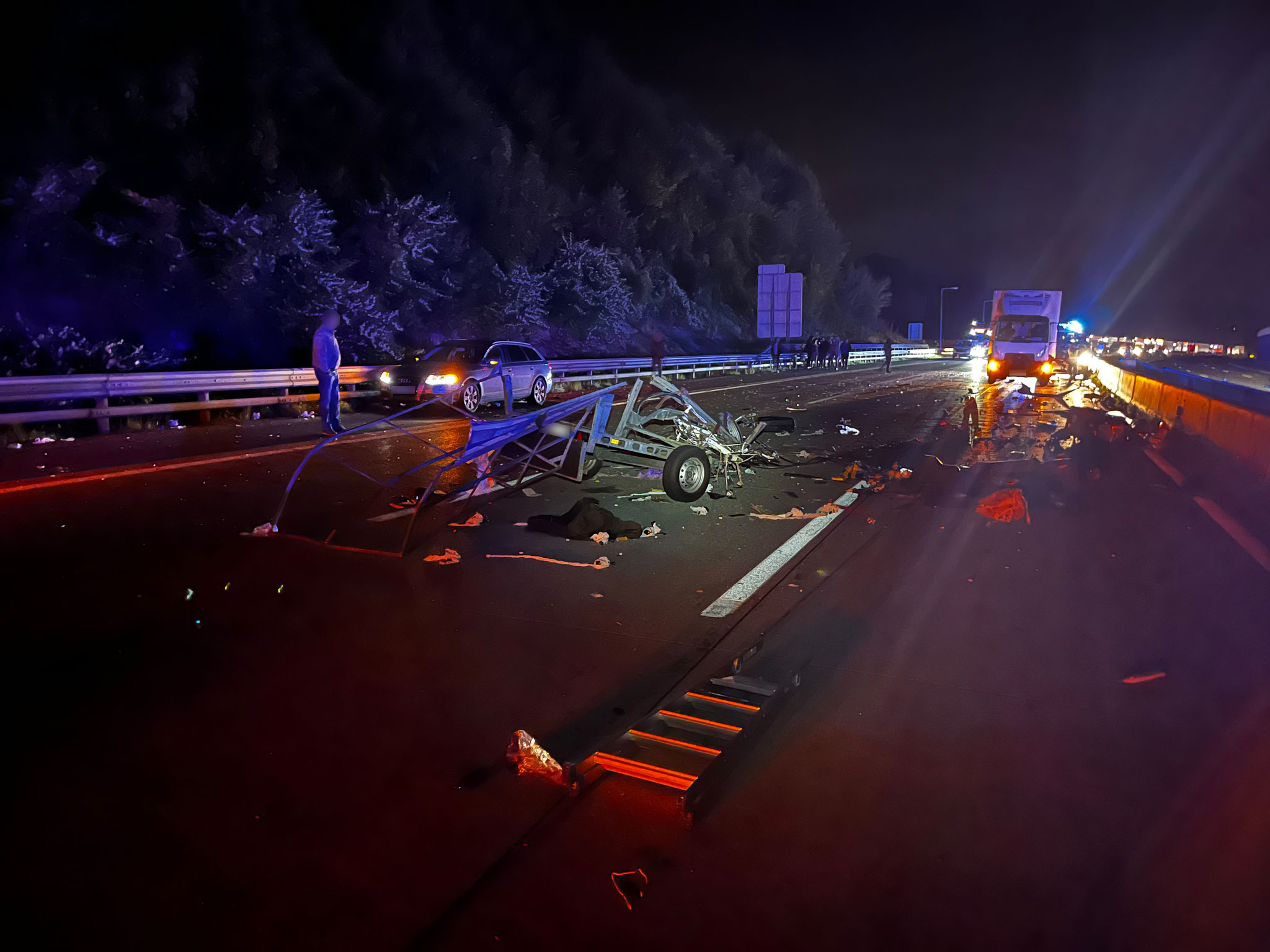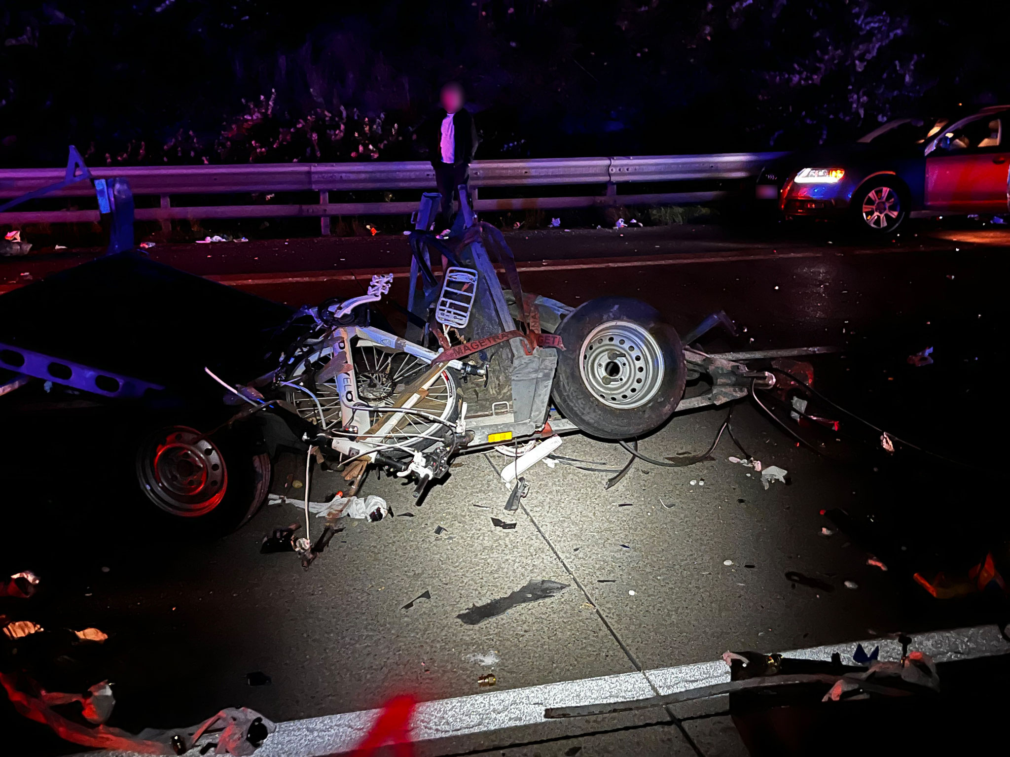 Ein PKW ist auf der 3. Spur auf einen PKW Anhänger aufgefahren. Der Anhänger löste sich vom Zugfahrzeug, überschlug sich mehrfach und blieb stark deformiert liegen, das Ladegut verteilte sich