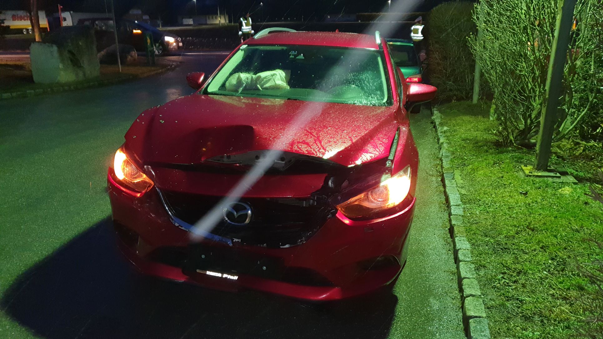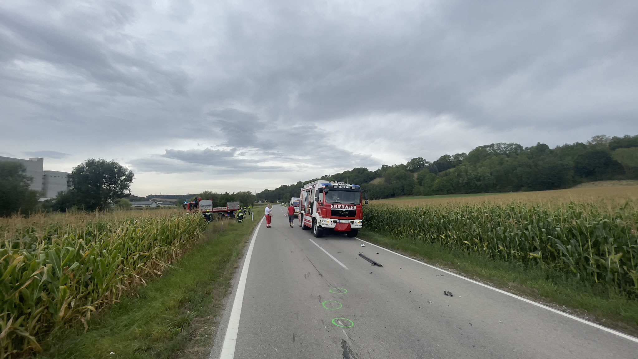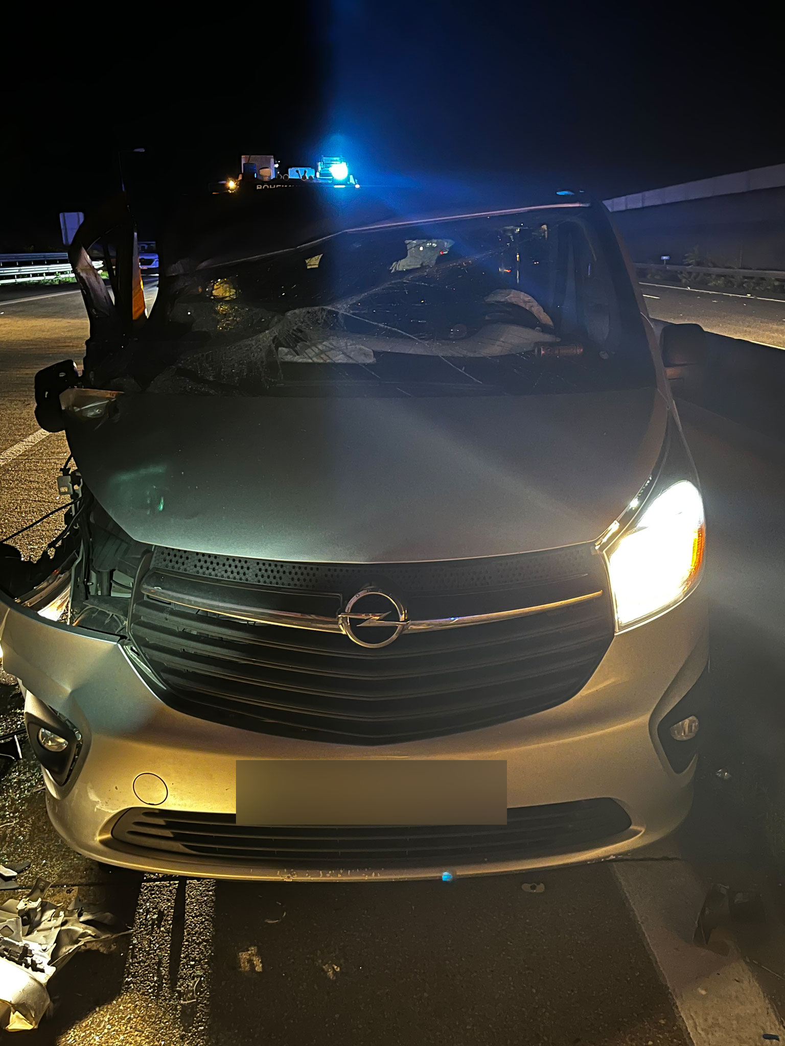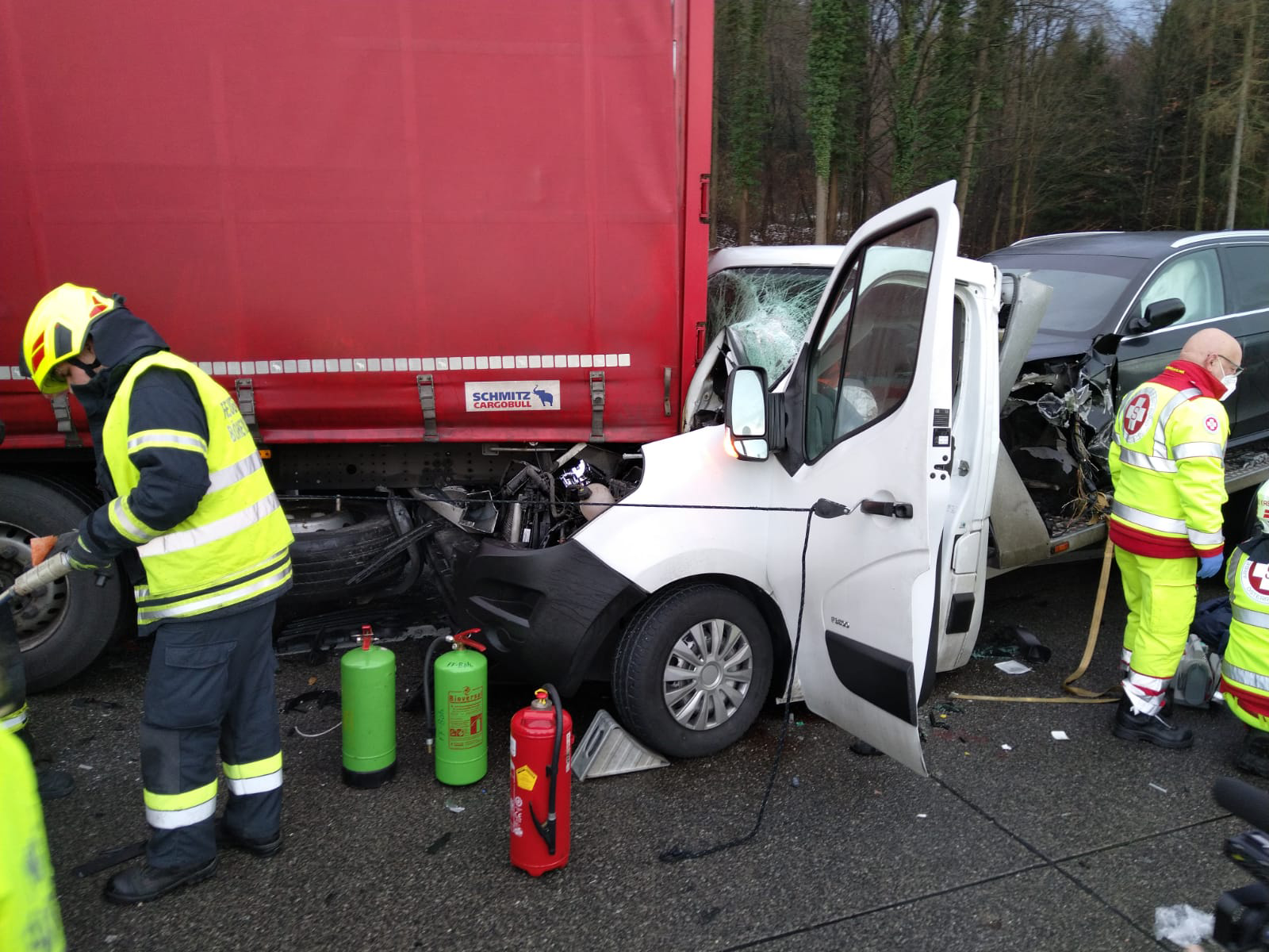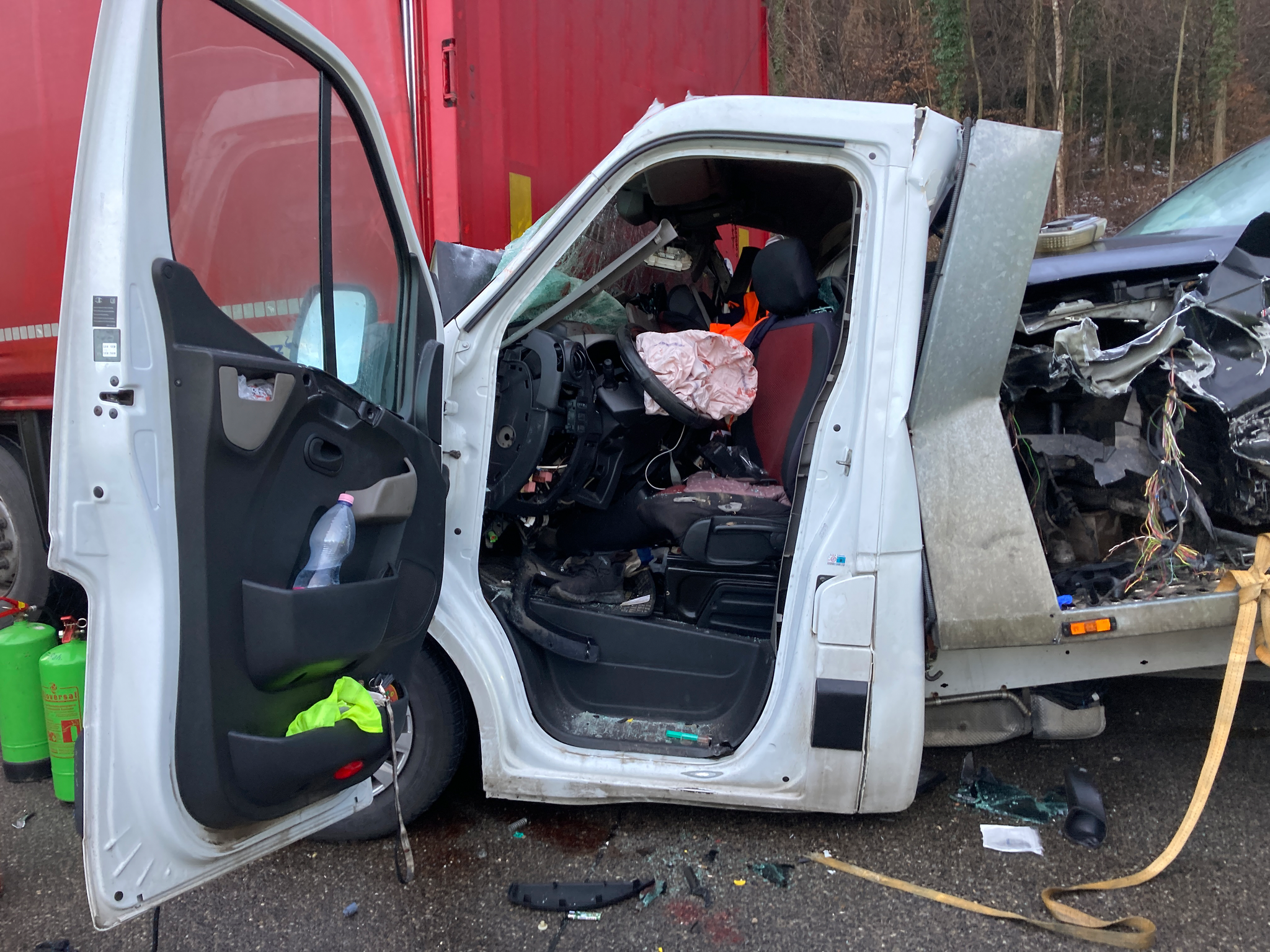 über die gesamte Fahrbahn. Ein nachkommender LKW konnte rechtzeitig bremsen, jedoch fuhr der darauffolgende Kleinbus auf den LKW auf und wurde stark beschädigt.