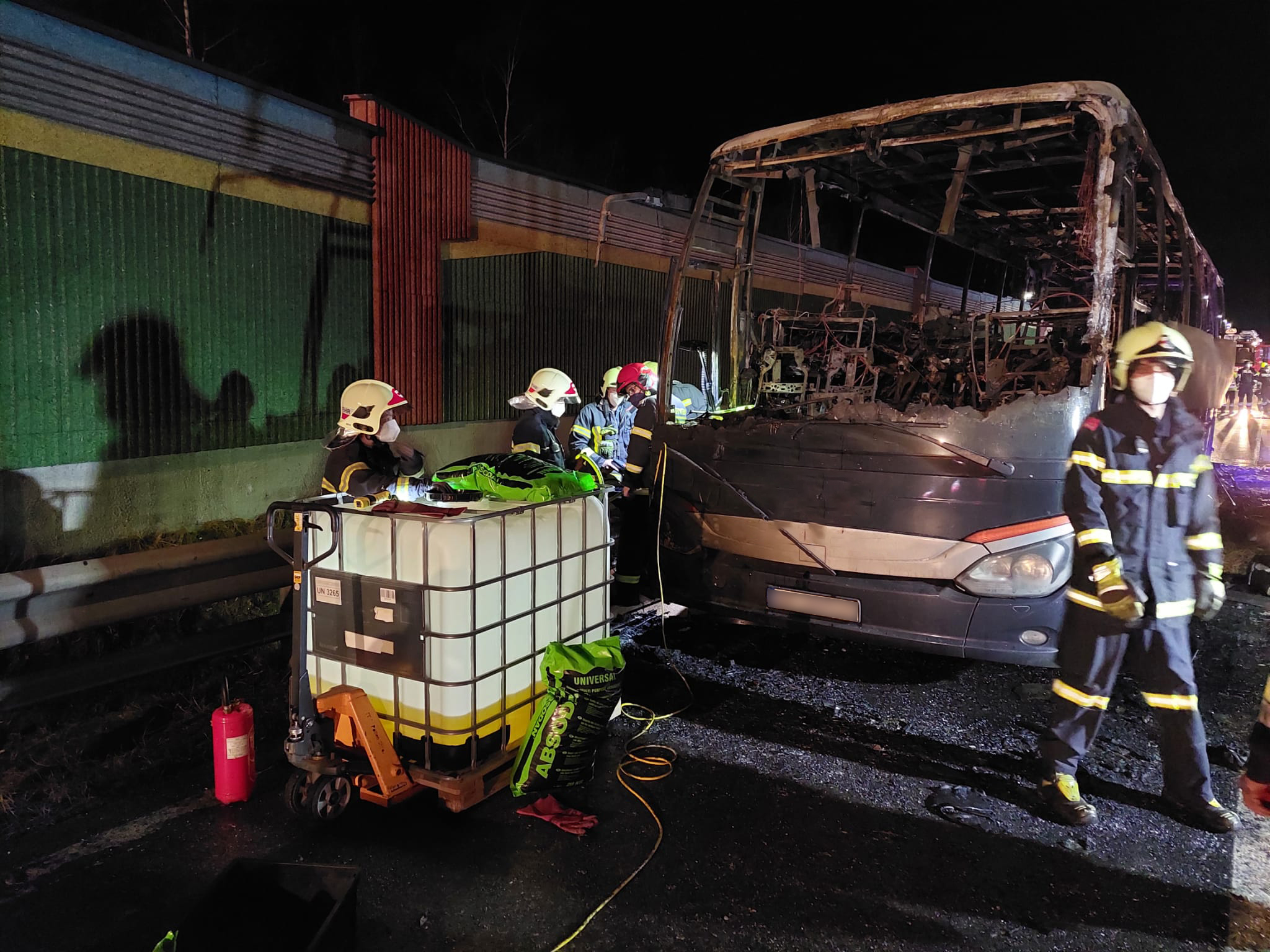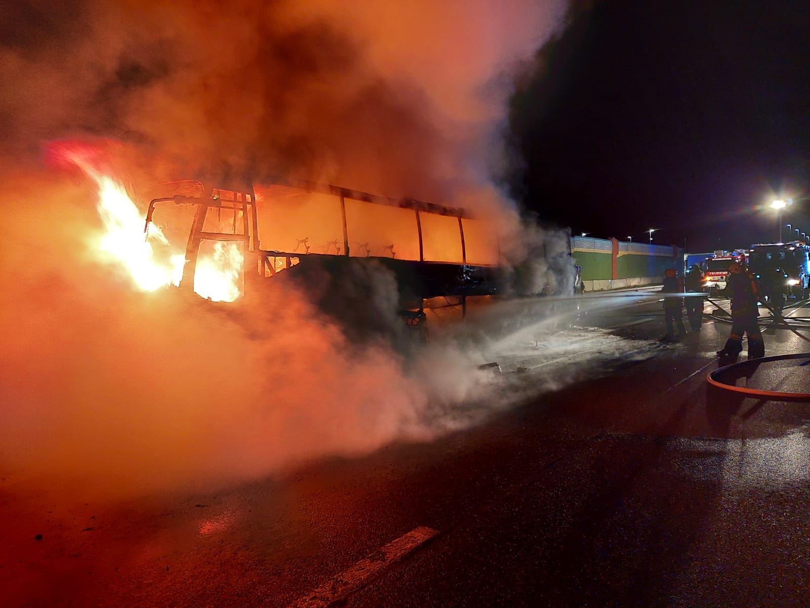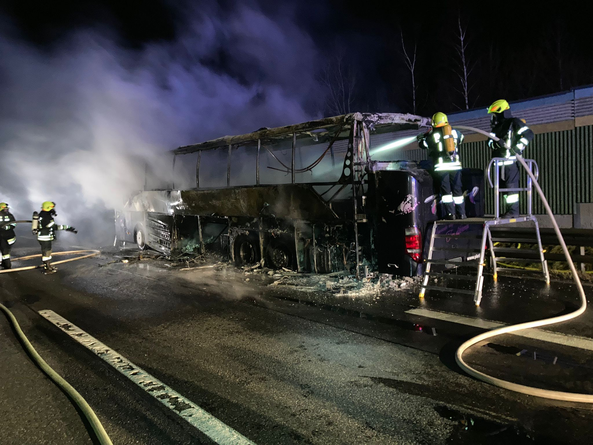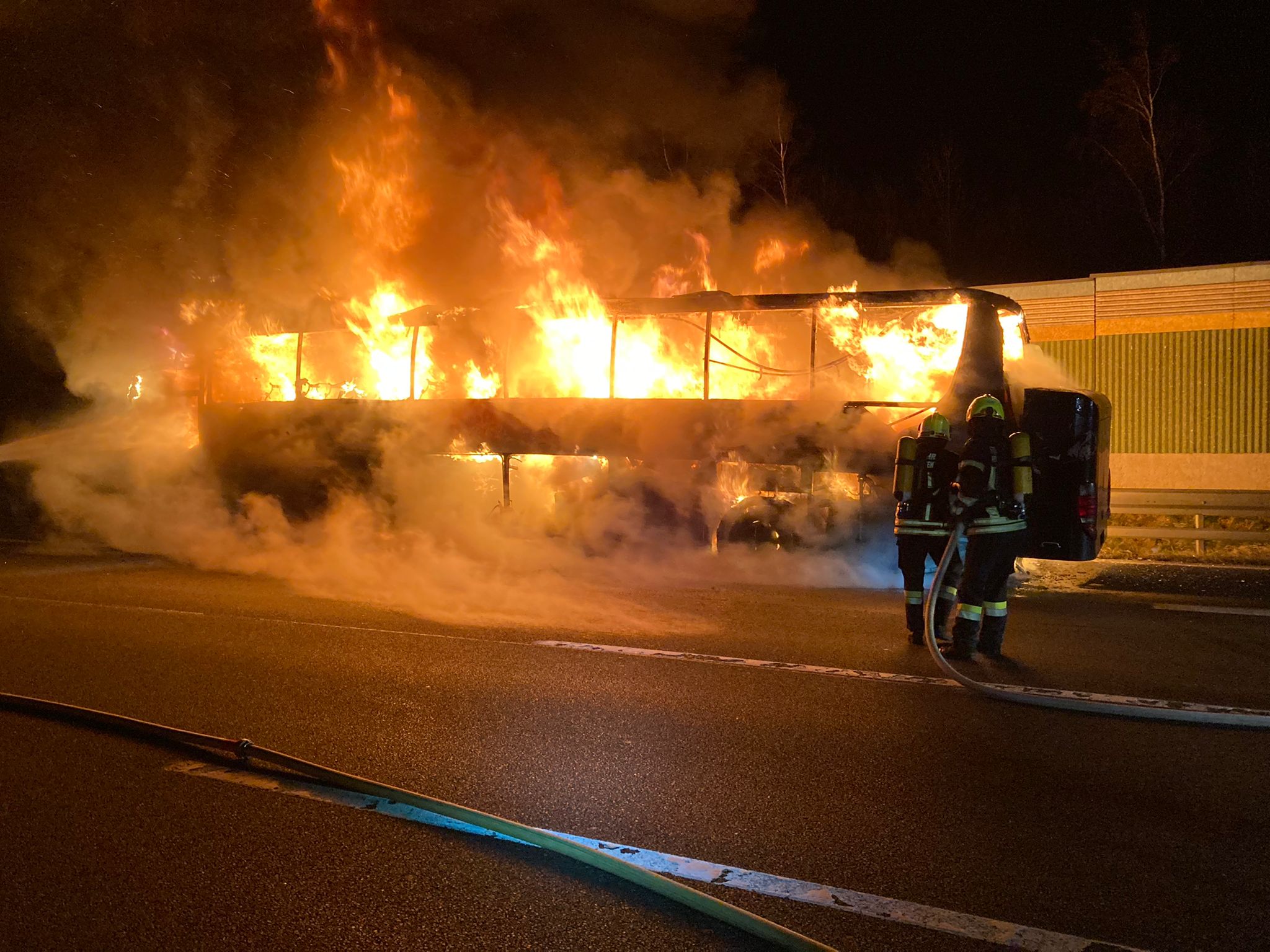 Der Vollbrand des Autobusses erzeugte große Strahlungswärme und neben den eigentlichen Löscharbeiten am Fahrzeug musste auch die Infrastruktur der Autobahn gekühlt werden.