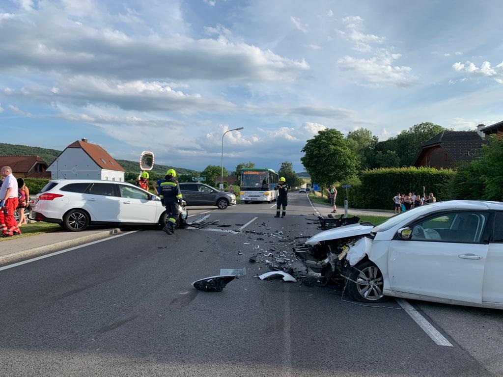 Beim Eintreffen am Einsatzort stellte sich heraus, dass zwei PKWs frontal zusammengefahren sind. Die Straße musste kurzfristig in beide Richtungen gesperrt werden, durch verbringung mittels