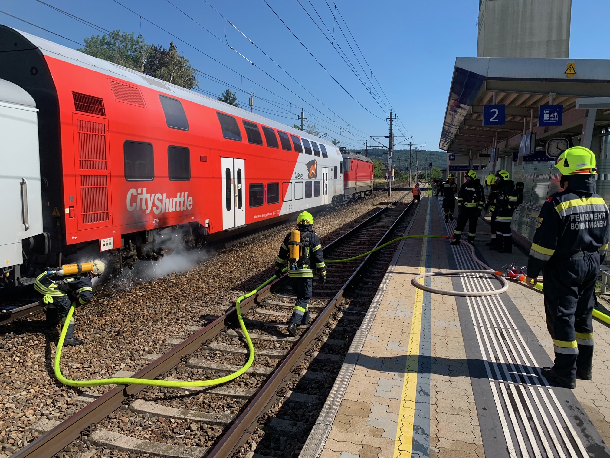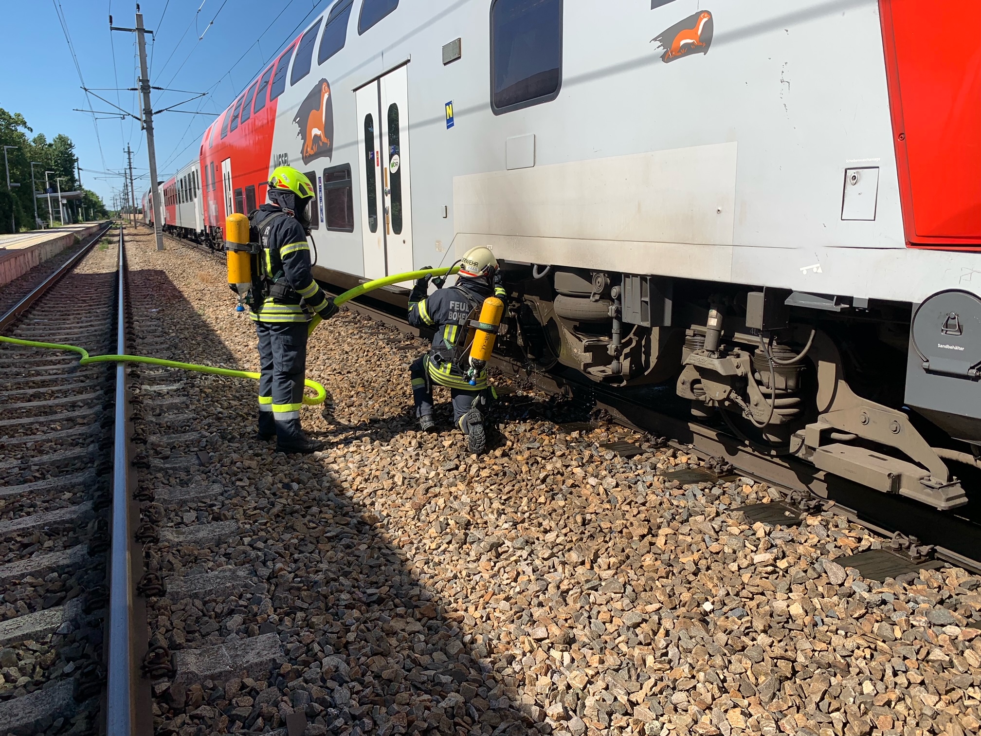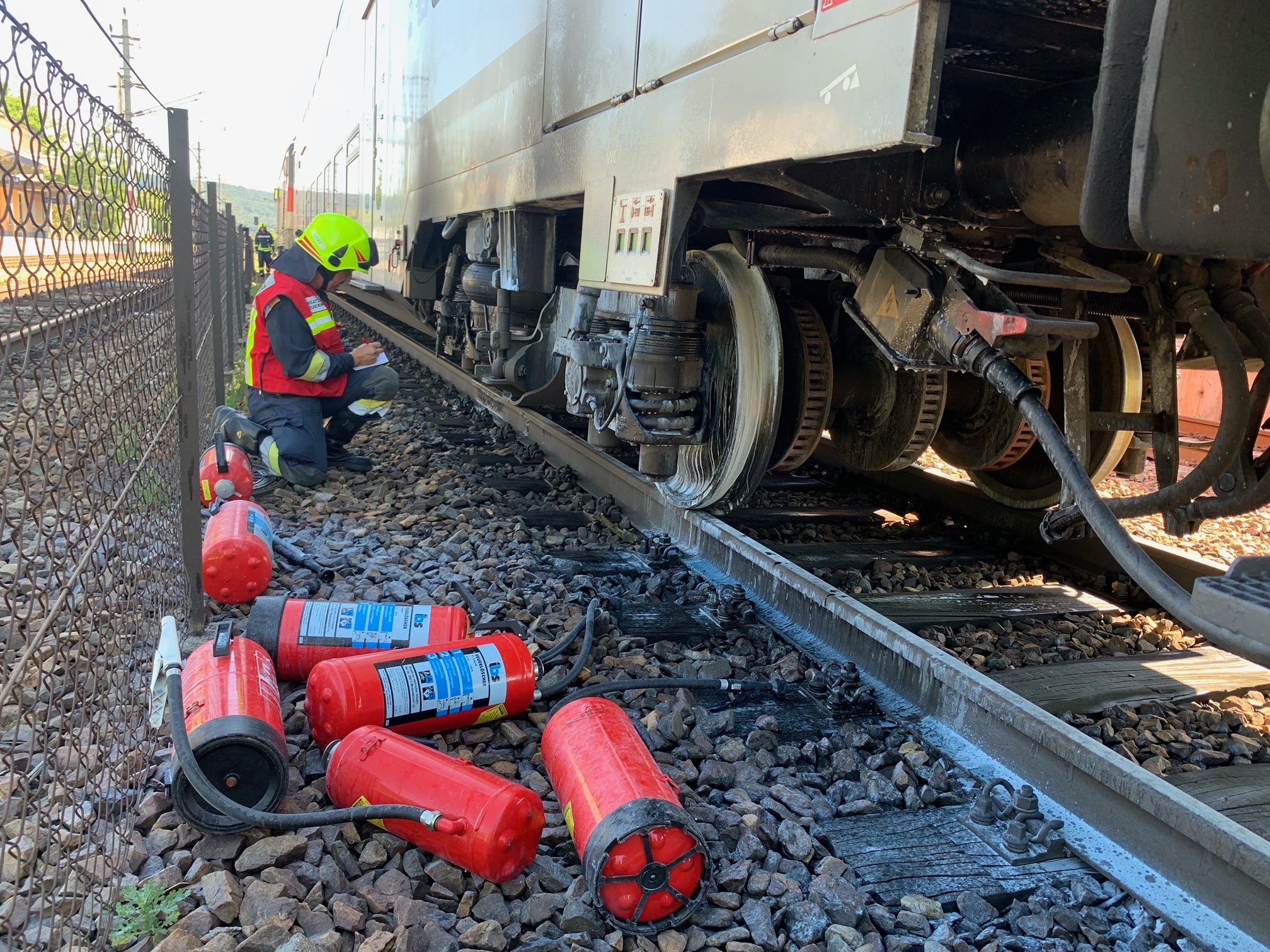 Unser Einsatzleiter ist mit dem MTF vorausgefahren und fand beim Eintreffen folgende Lage: Rauchentwicklung im Bereich der Drehgestelle des Steuerwagens eines Zuges auf Überstellungsfahrt (=ohne