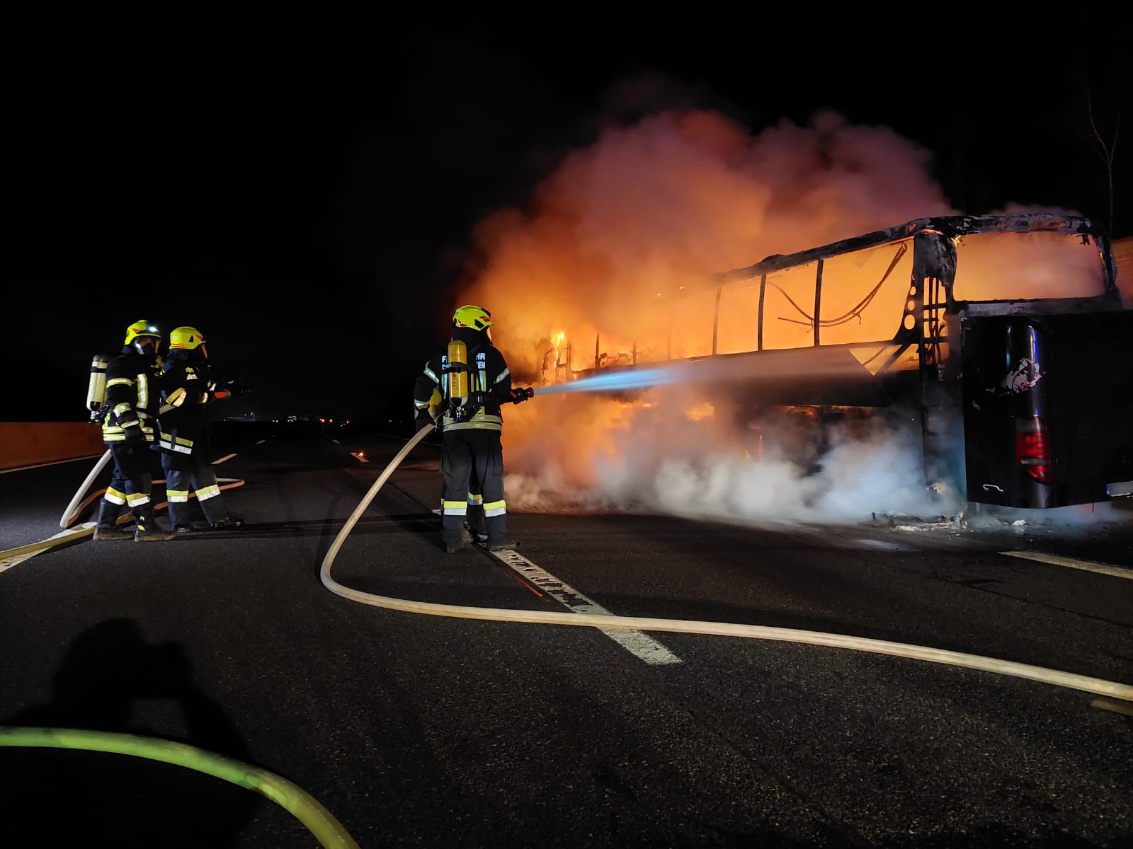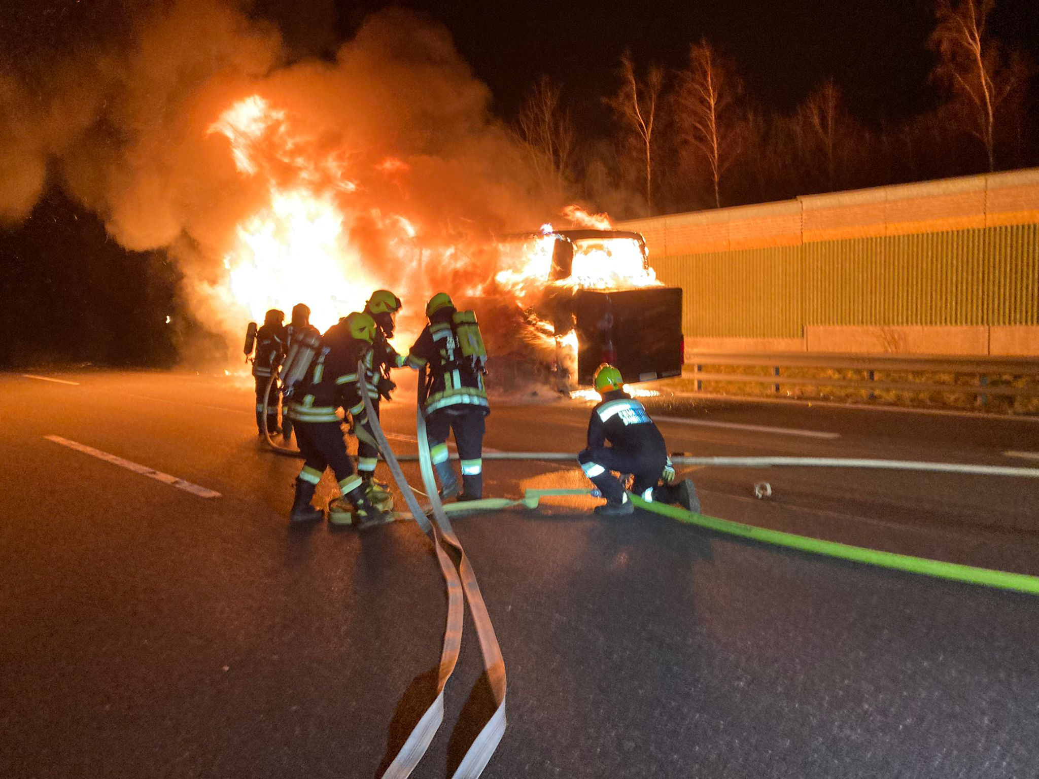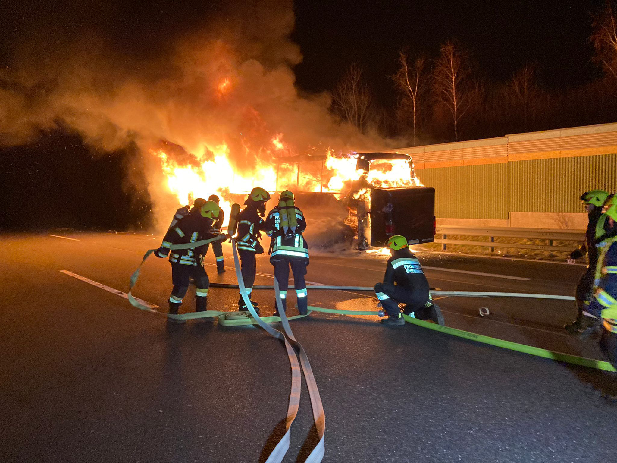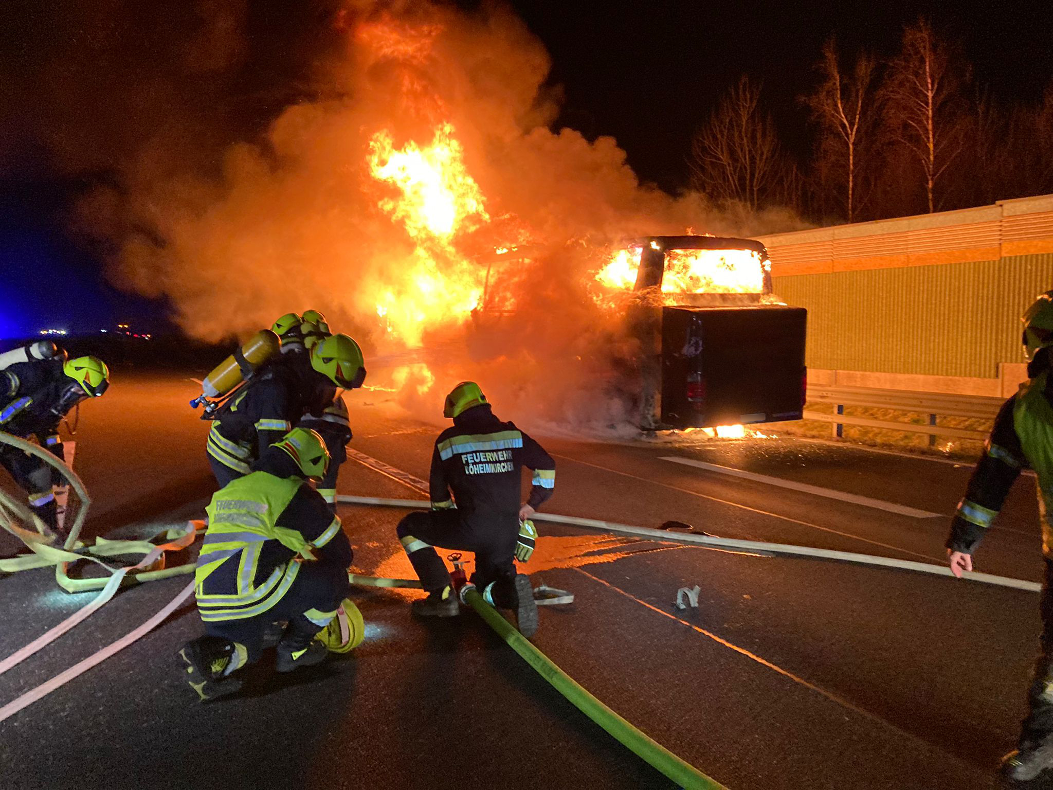 wird. So konnte unverzüglich mit der Brandbekämpfung mittels 2 Hohlstrahlrohren begonnen werden. Gleichzeitig ordnete die Polizei die Totalsperre der A1 für die Dauer der Löscharbeiten an und